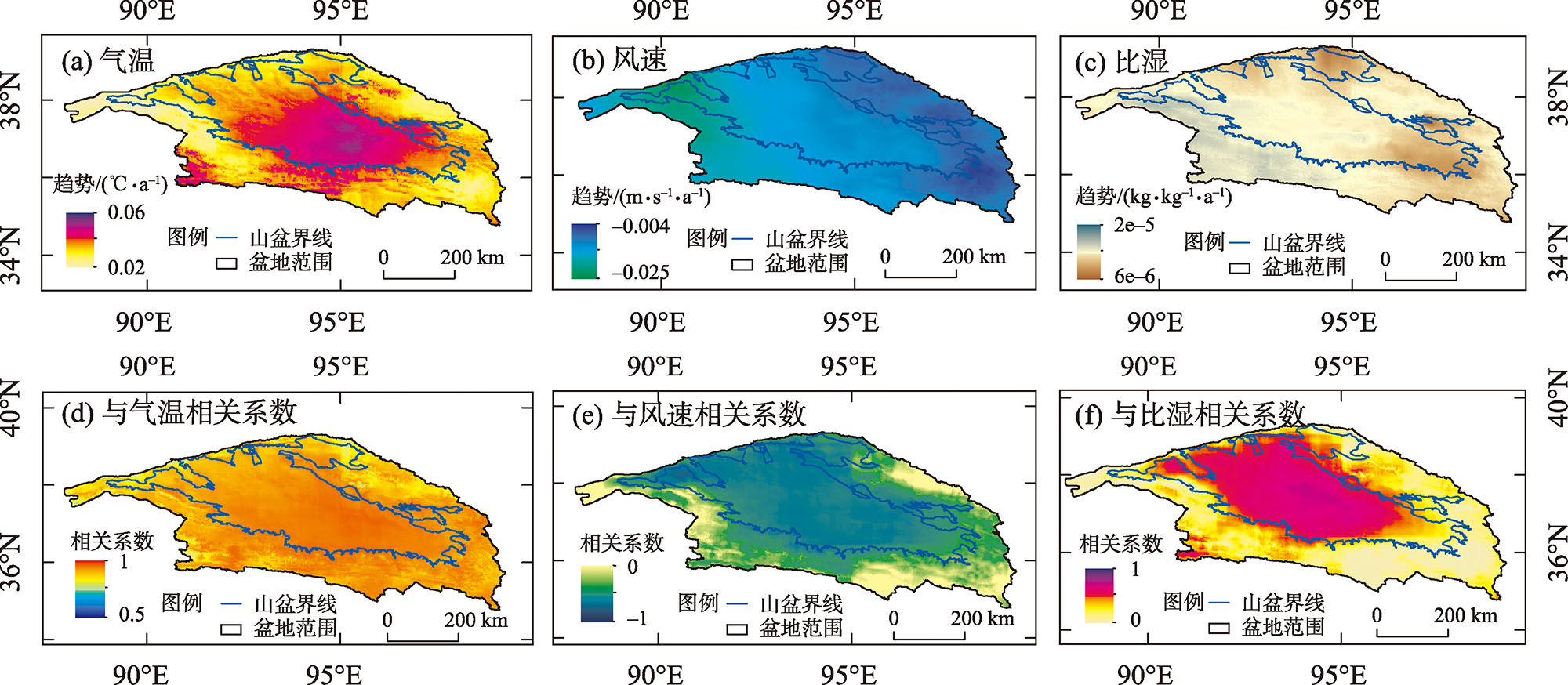 图6 1979—2020年气象要素气温(a)、风速(b)和比湿(c)的变化趋势及人体舒适度指数与气温(d)、风速(e)和比湿(f)的相关系数Fig. 6 Trends of meteorological elements with air temperature (a), wind speed (b), and specific humidity (c) during 1979‒2020, correlation coefficients of IBC with air temperature (d), wind speed (e), and specific humidity (f) |
