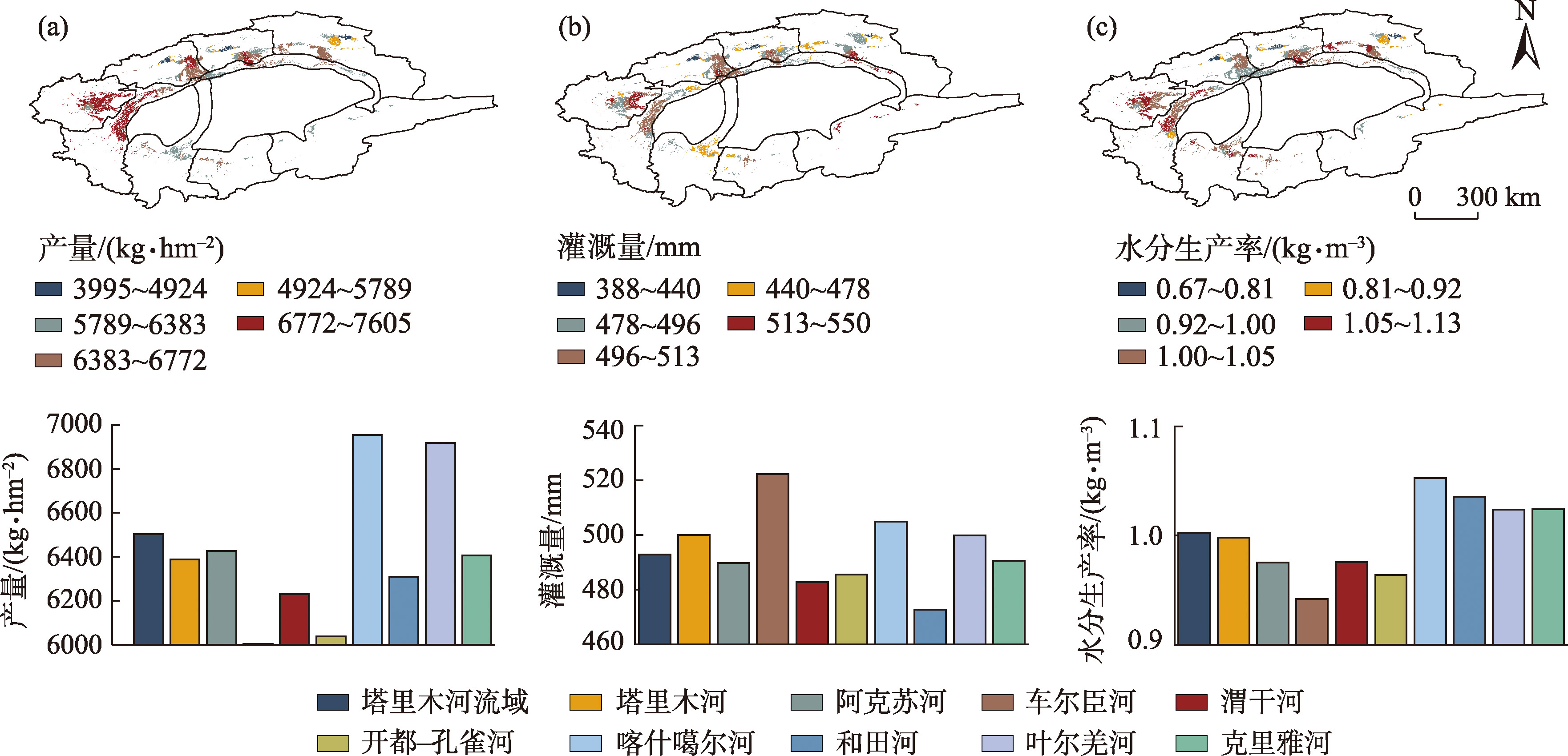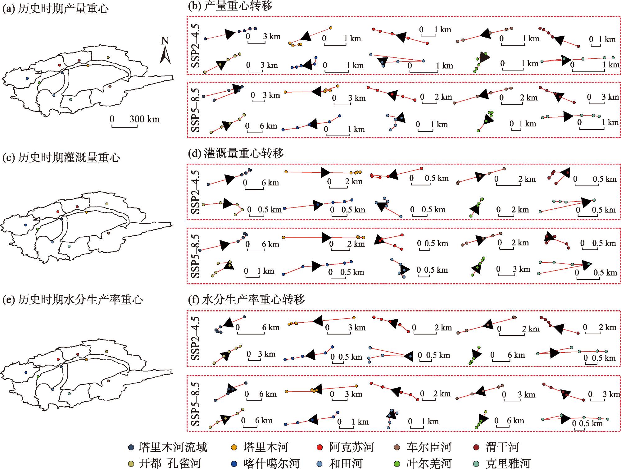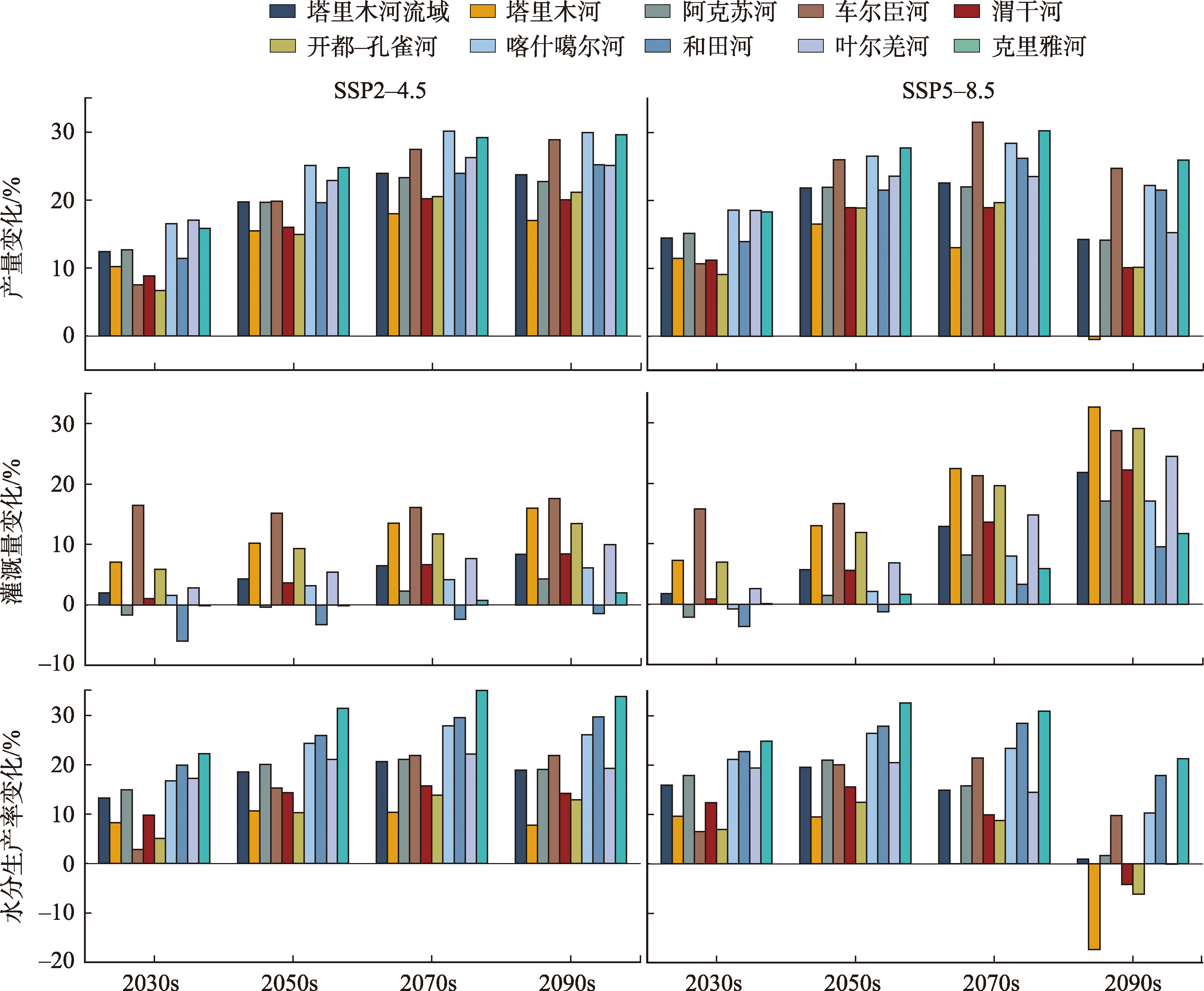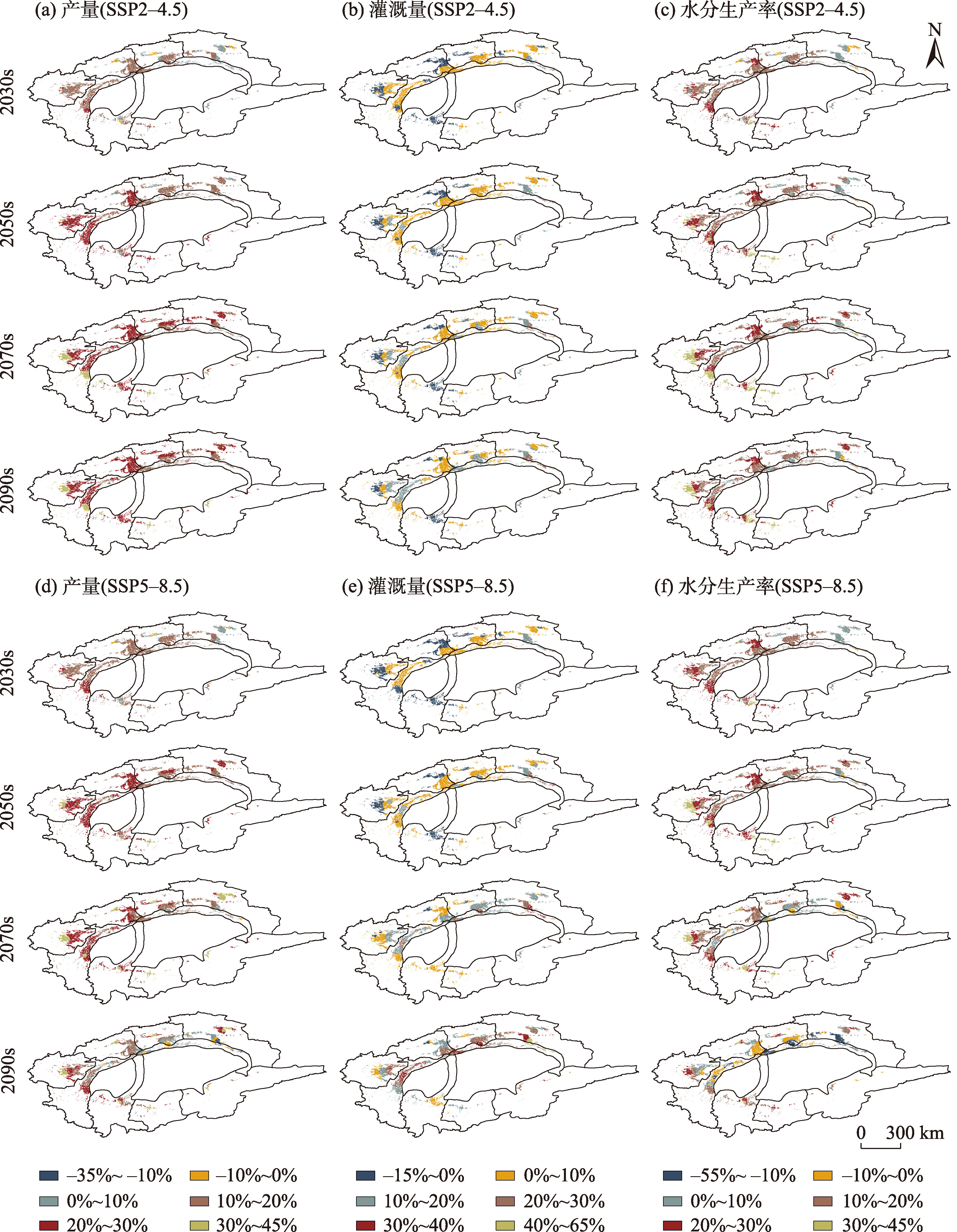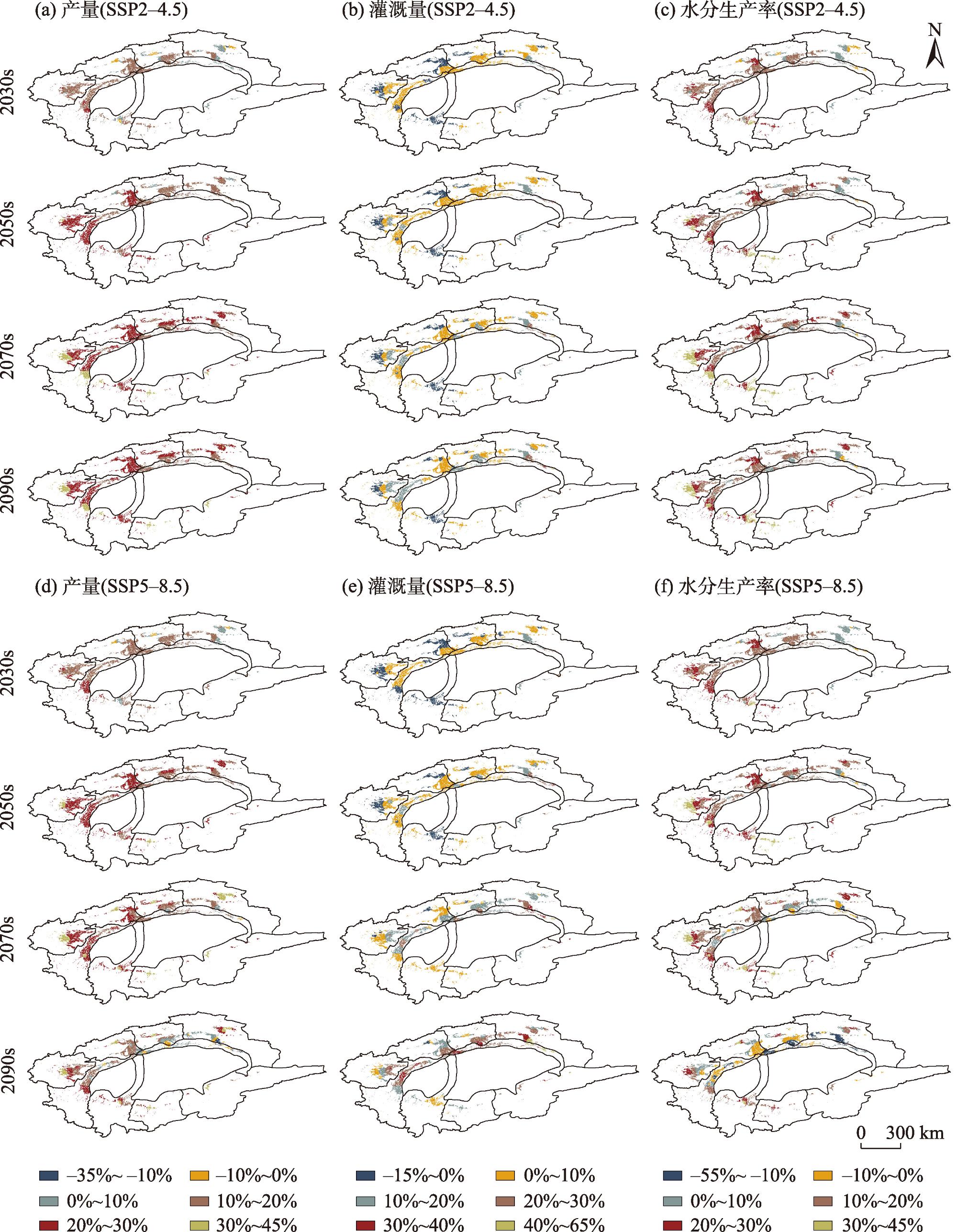 图6 未来情景下棉花产量、灌溉量和水分生产率变化空间特征Fig. 6 Spatial variation characteristics of cotton yield, irrigation amount and water productivity under future scenarios |