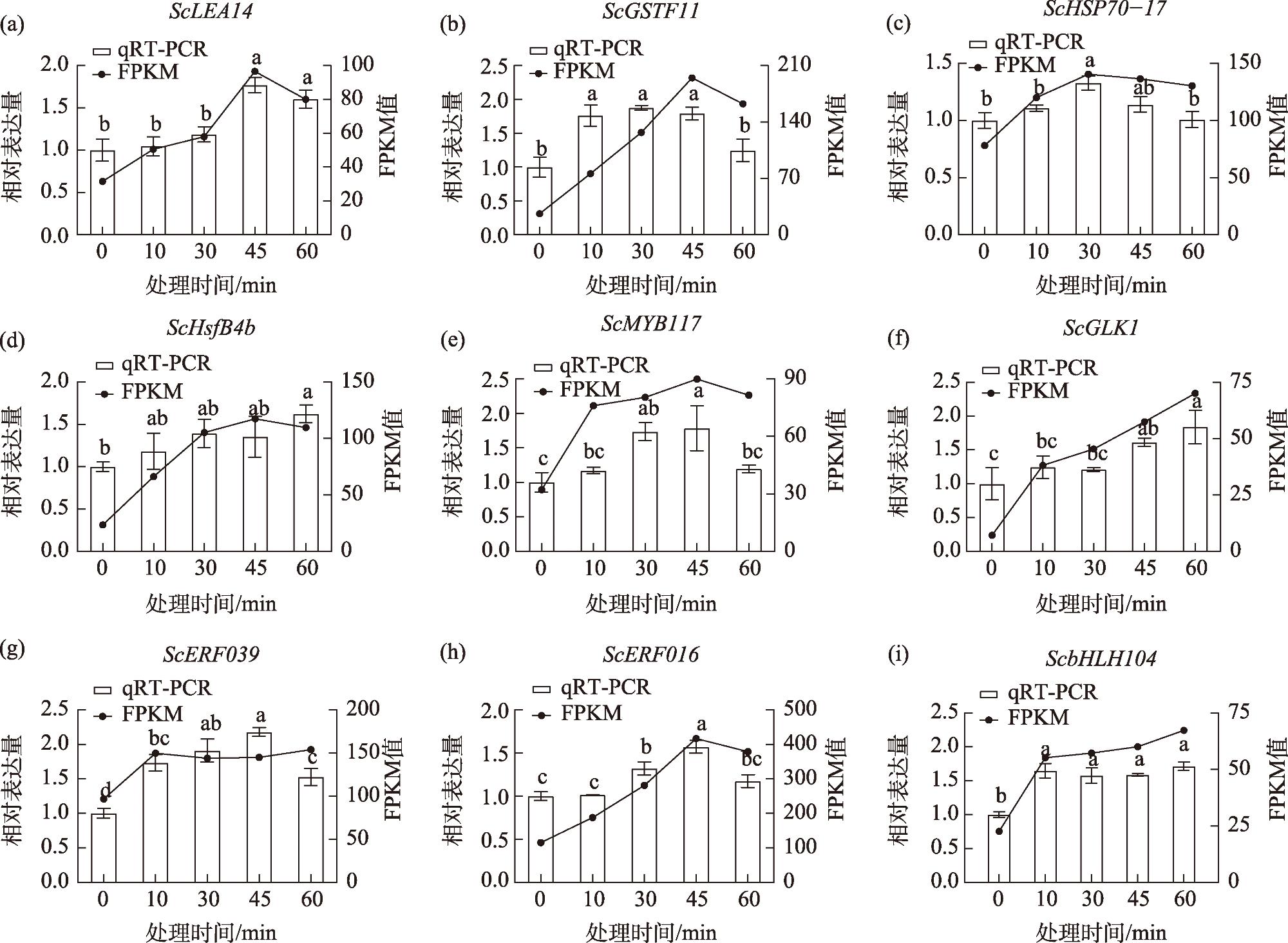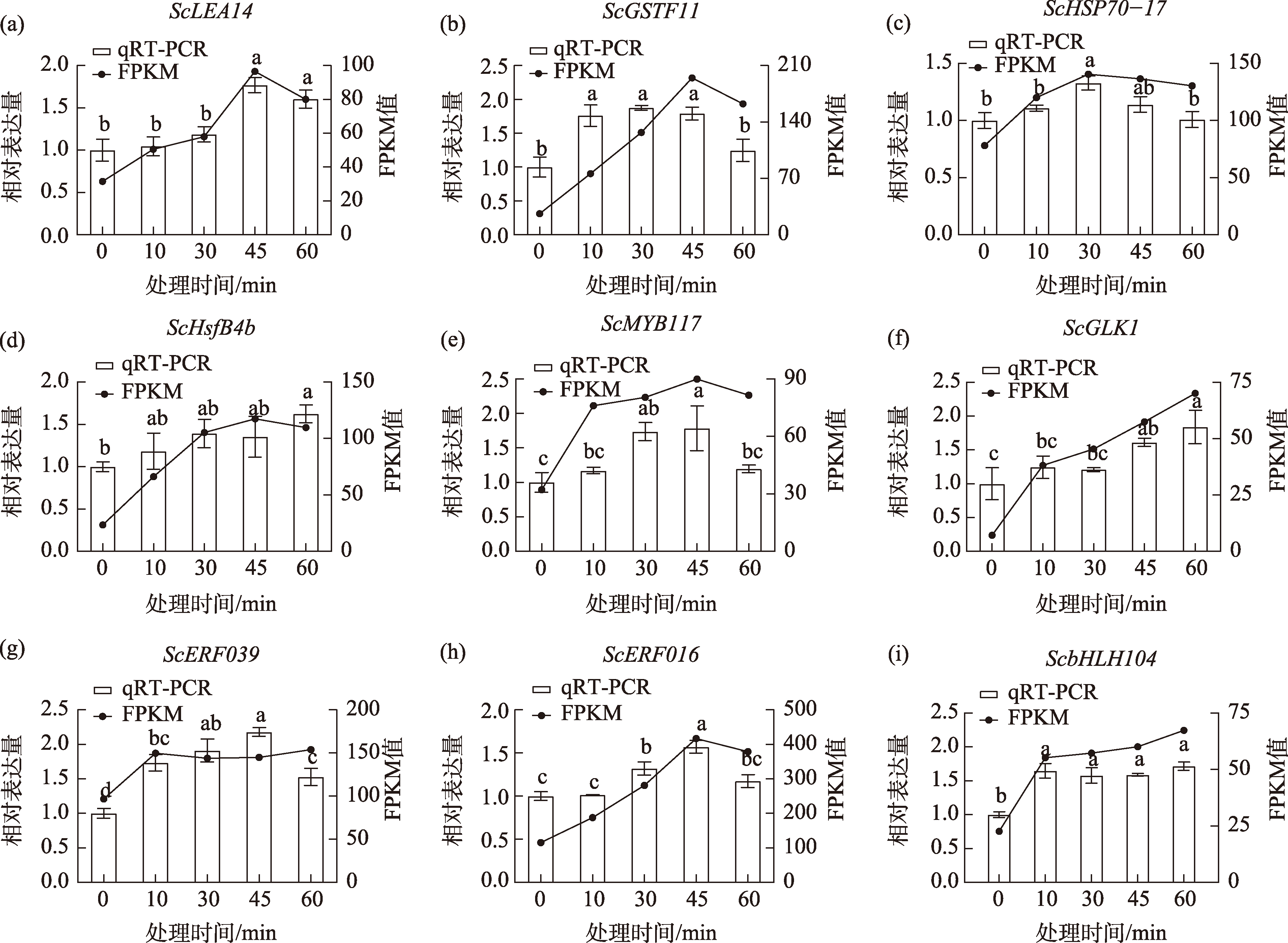 图1 齿肋赤藓9个耐热相关基因在高温处理下实时荧光定量PCR分析和RNA-Seq基因表达谱注:FPKM是指每百万个比对上的reads中比对到外显子的每1000个碱基上的片段个数;相同小写字母为差异不显著,不同小写字母为差异显著,小写字母表示显著水平α=0.05。下同。 Fig. 1 Quantitative real-time PCR analysis and RNA-Seq gene expression profiles of nine heat-tolerance-associated genes under high-temperature treatment of Syntrichia caninervis |