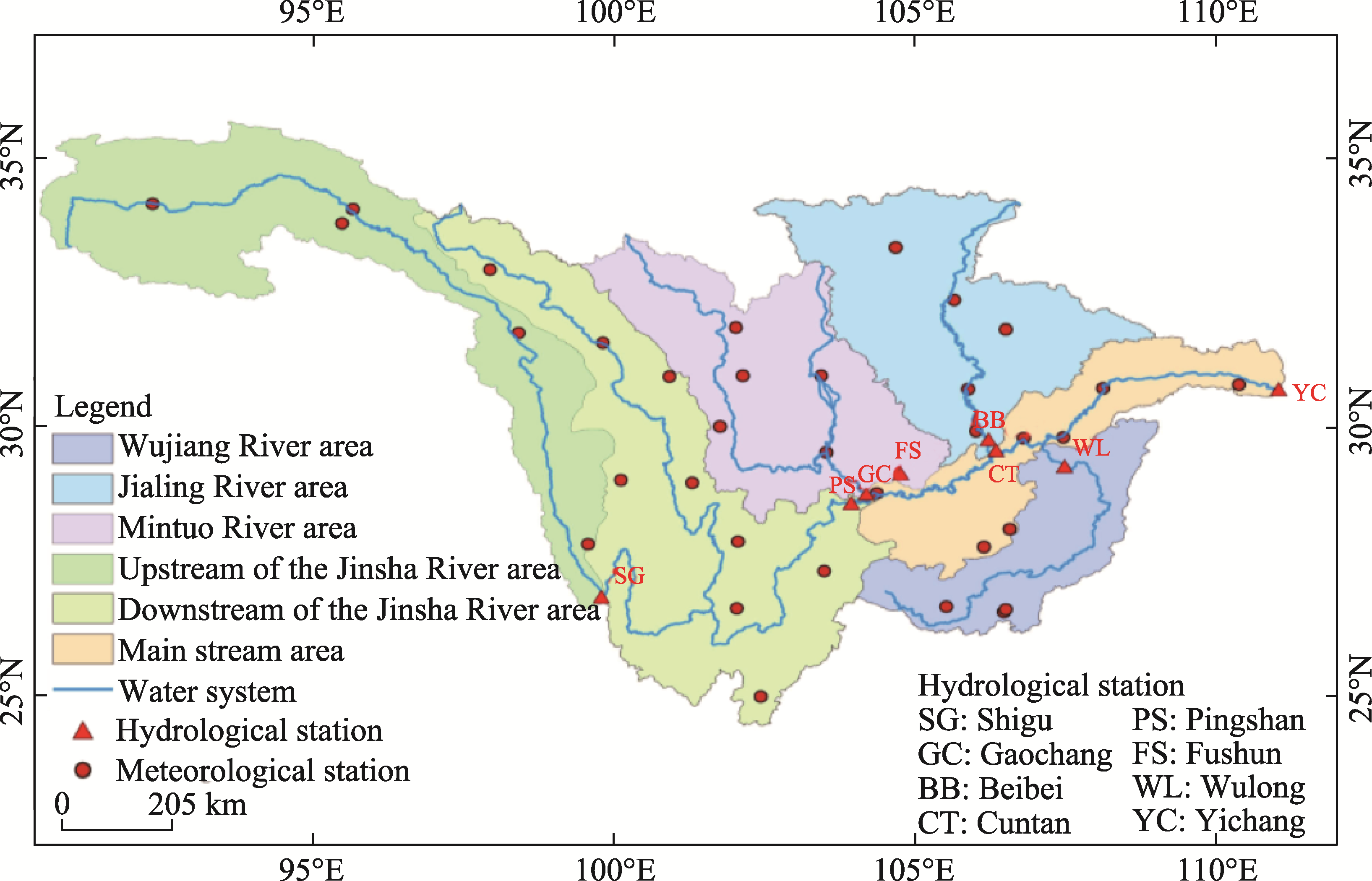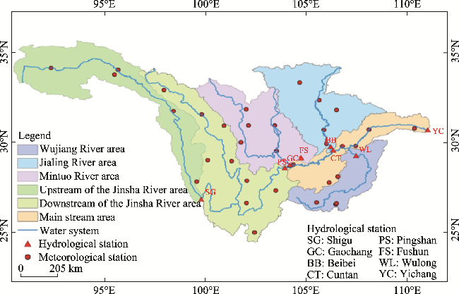 Fig. 1 Location and hydrological and meteorological stations of the study area |