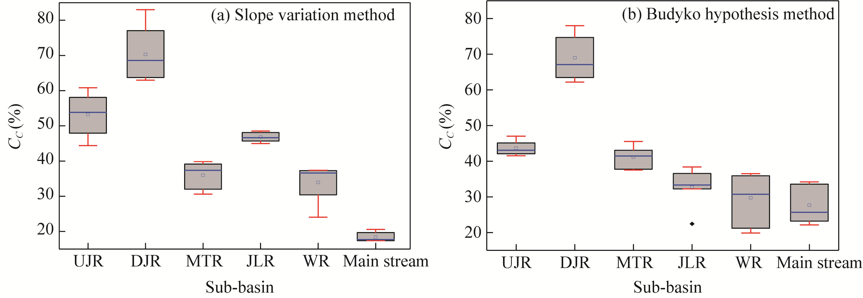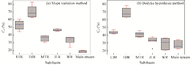 Fig. 8 Boxplot graph of adaptation of slope variation method (a) and Budyko hypothesis method (b). CC is the contribution of climate factors to runoff. Boxes indicate the IQR (interquartile range, 75th to 25th of the data). The median value is shown as a line within the box; square is shown as mean; and black diamond is outlier. Whiskers extend to the most extreme value within 1.5×IQR. |
