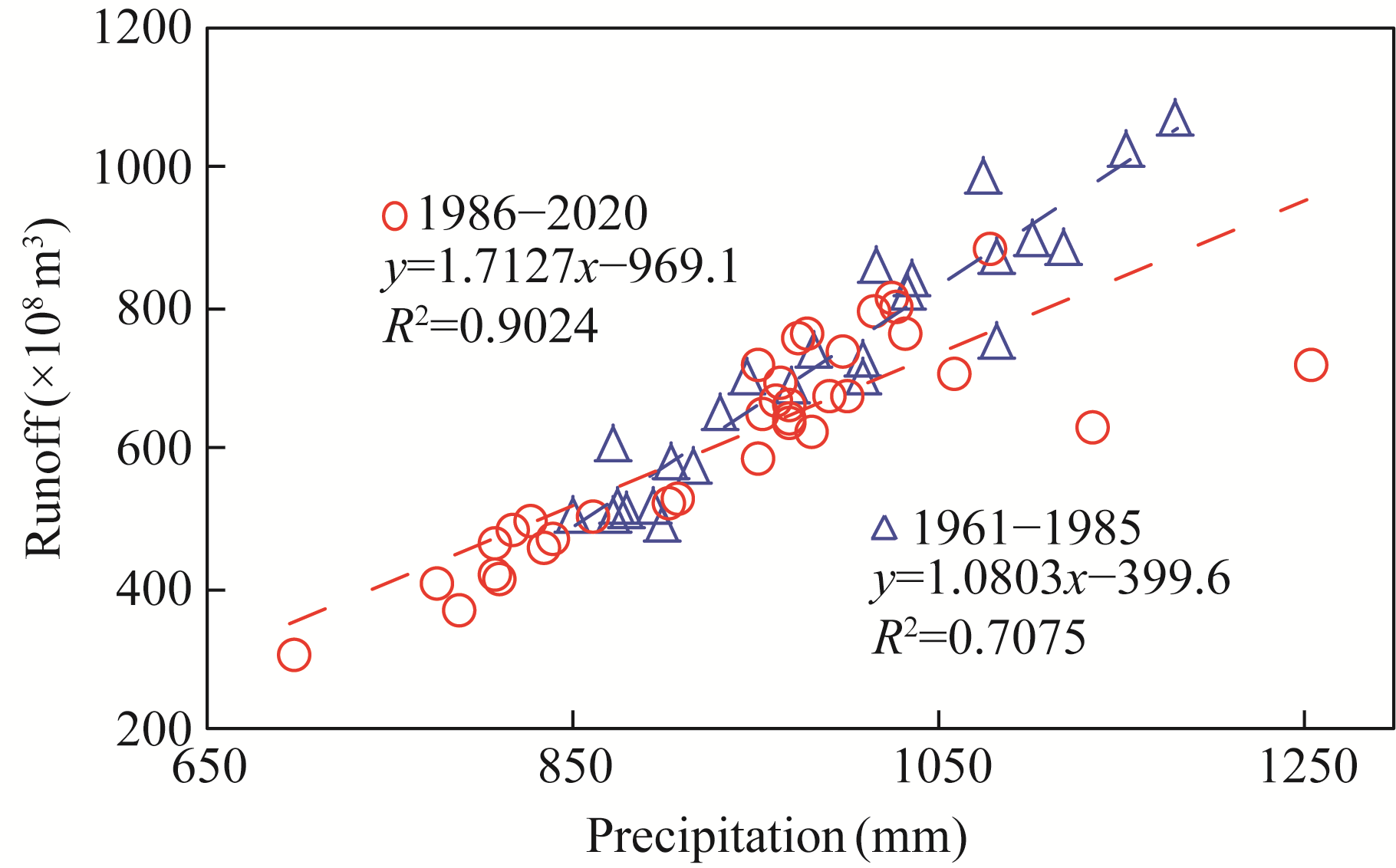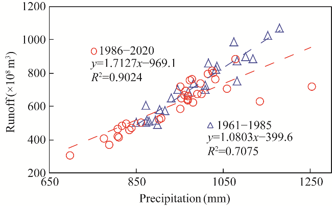 Fig. 9 Relationship between precipitation and runoff in different periods. 1961-1985, baseline period; 1886-2020, changing period. |
