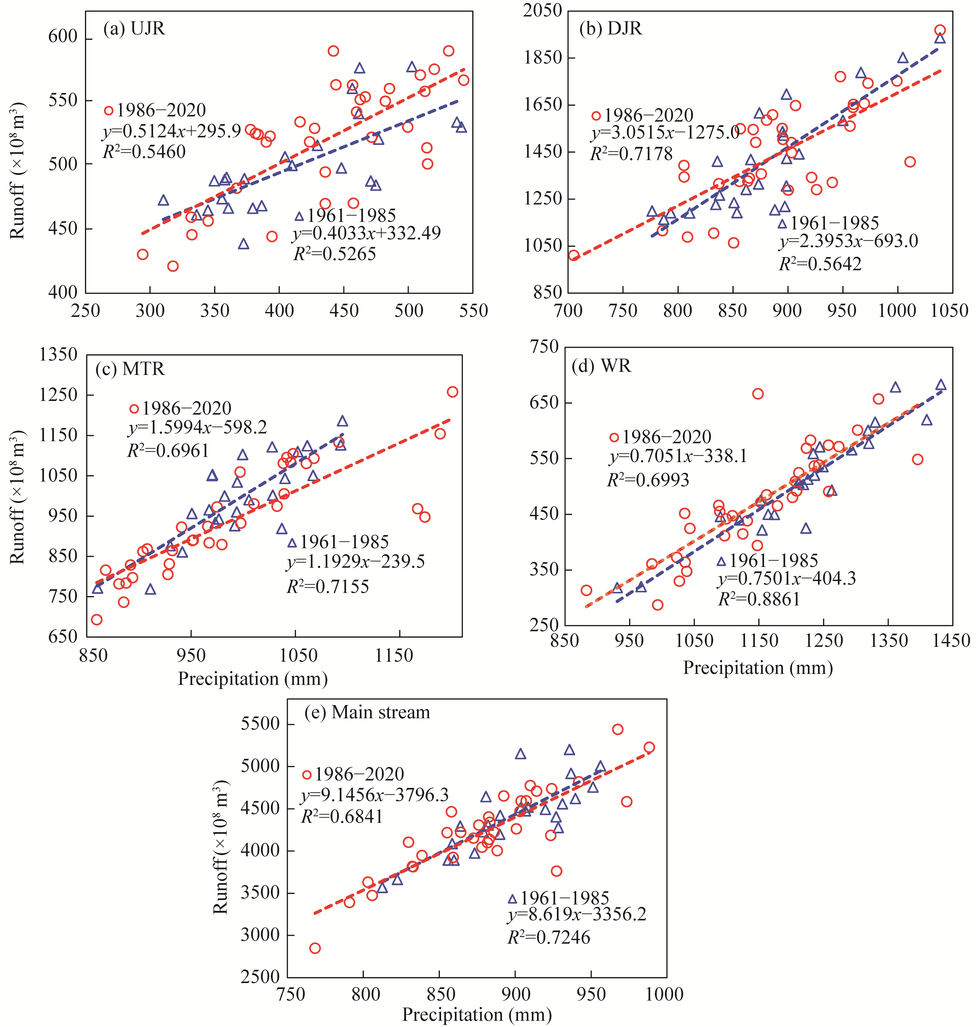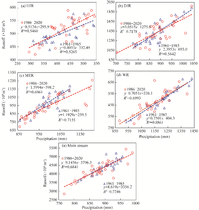 Fig. S3 Relationship between precipitation and runoff in different periods for five sub-basins. (a), UJR (upstream of the Jinsha River); (b), DJR (downstream of the Jinsha River); (c), MTR (Mintuo River); (d), WR, Wujiang River; (e), main stream of the upper reaches of the Yangtze River basin. 1961-1985, baseline period; 1886-2020, changing period. |