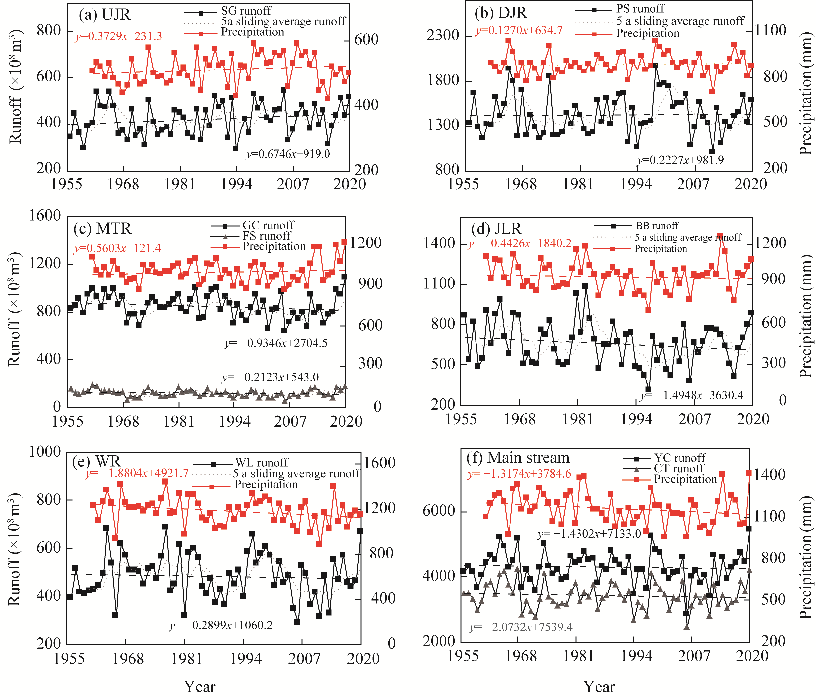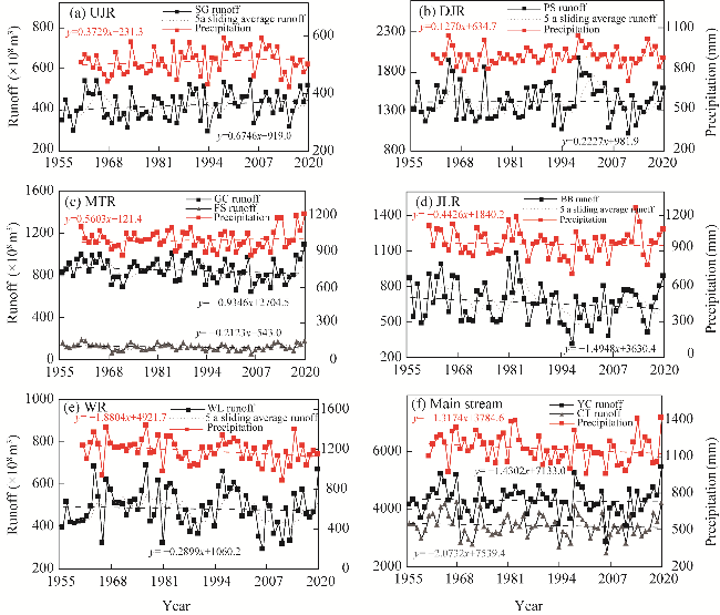 Fig. 2 Annual runoff trends of eight hydrological stations and surface precipitation in six sub-basins of the upper reaches of the Yangtze River basin. (a), UJR (upstream of the Jinsha River); (b), DJR (downstream of the Jinsha River); (c), MTR (Mintuo River); (d), JLR (Jialing River); (e), WR (Wujiang River); (f), main stream of the upper reaches of the Yangtze River basin. SG, Shigu; PS, Pingshan; GC, Gaochang; FS, Fushun; BB, Beibei; WL, Wulong; YC, Yichang; CT, Cuntan. The abbreviations are the same in the following figures. |