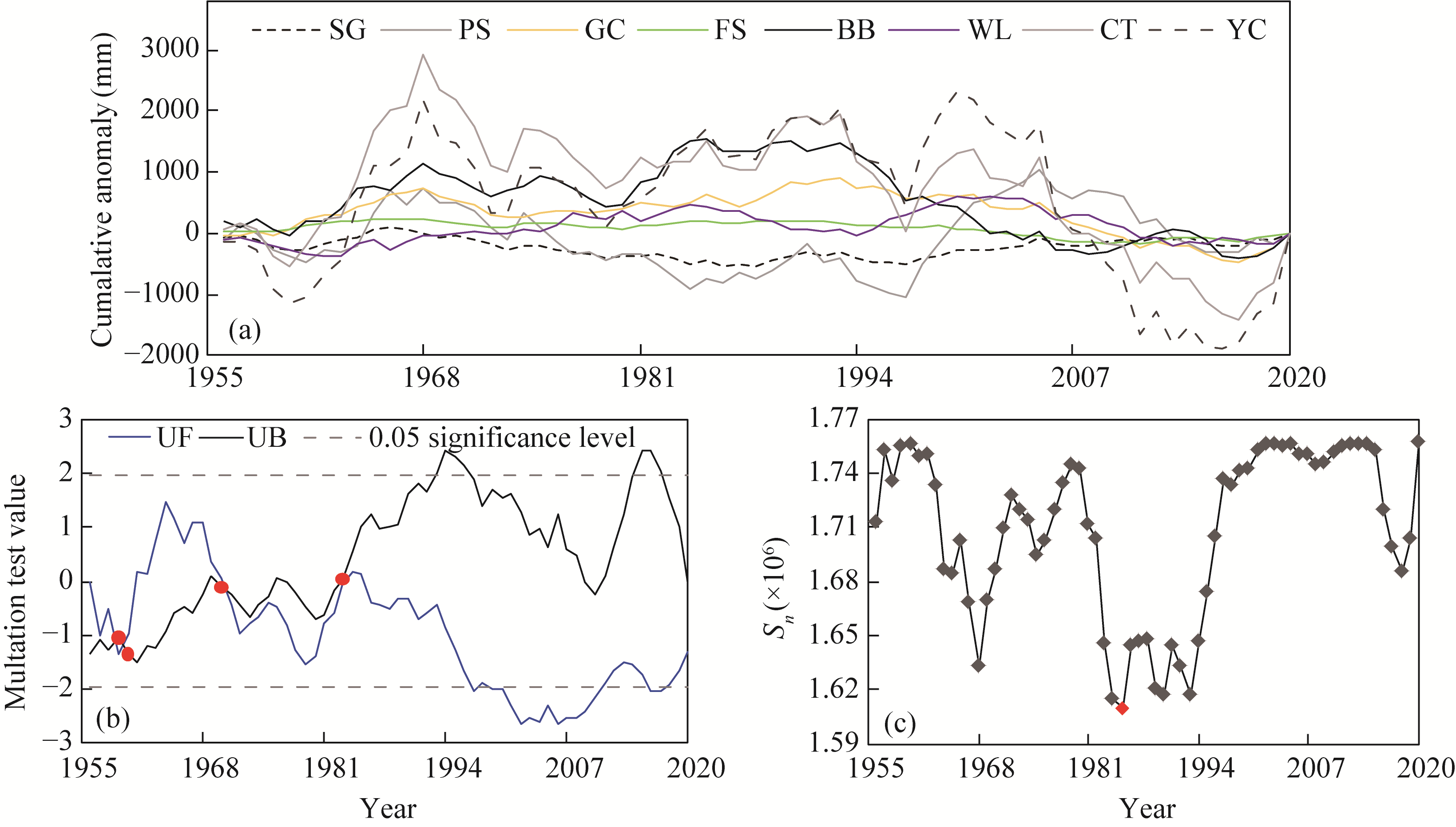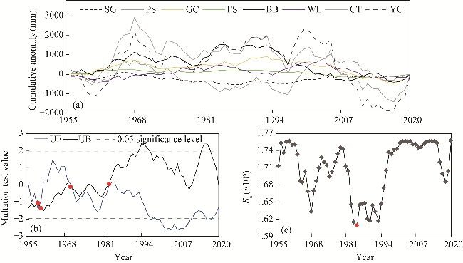 Fig. 3 Mutation test results of runoff. (a), cumulative anomalies of eight hydrological stations; (b), results of the Mann-Kendall test, the red points are intersection points of UF and UB (two statistic series curves); (c), ordered clustering method for the BB (Beibei) station, and the red point is the minimum Sn (total sum of squared deviation). |