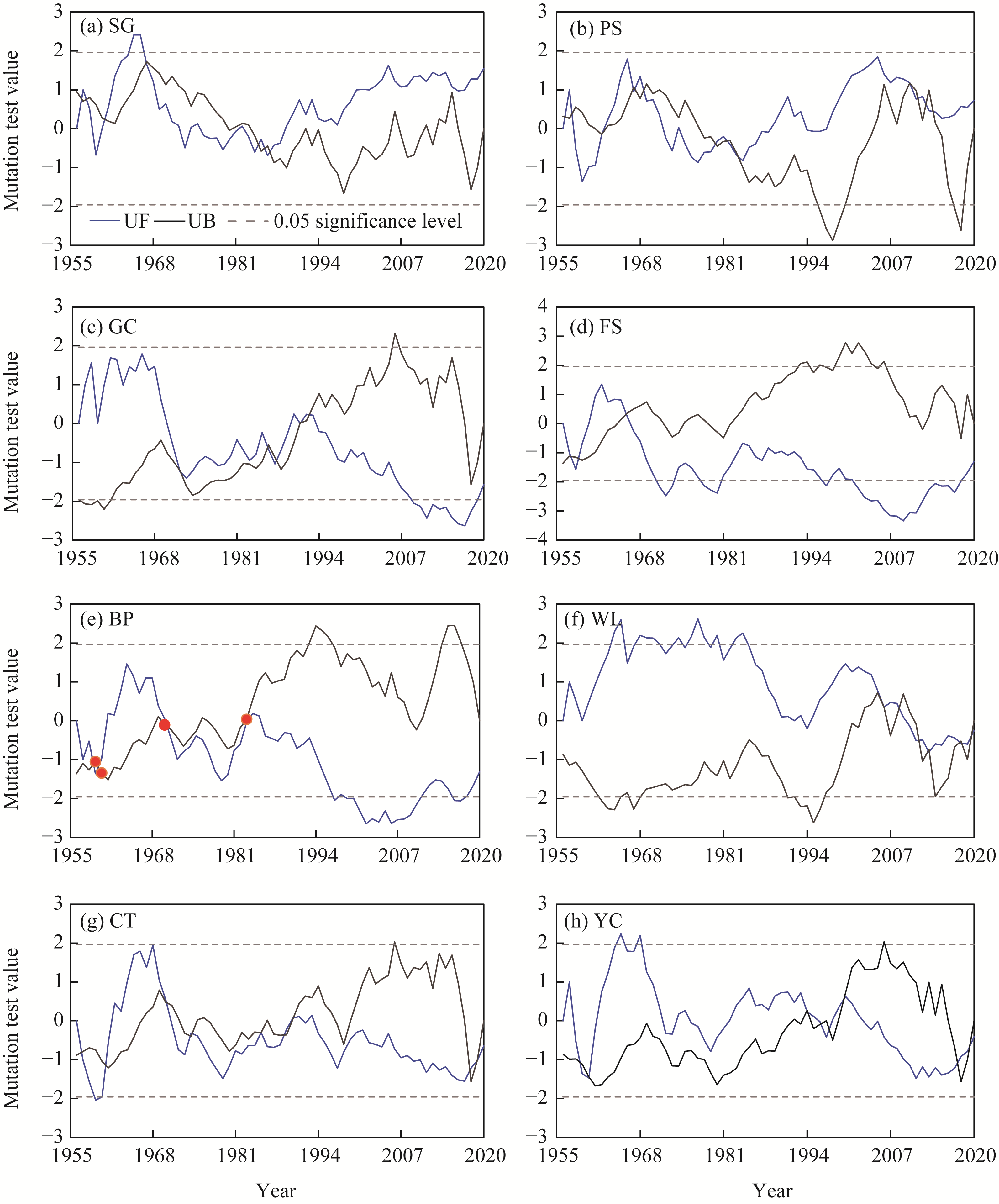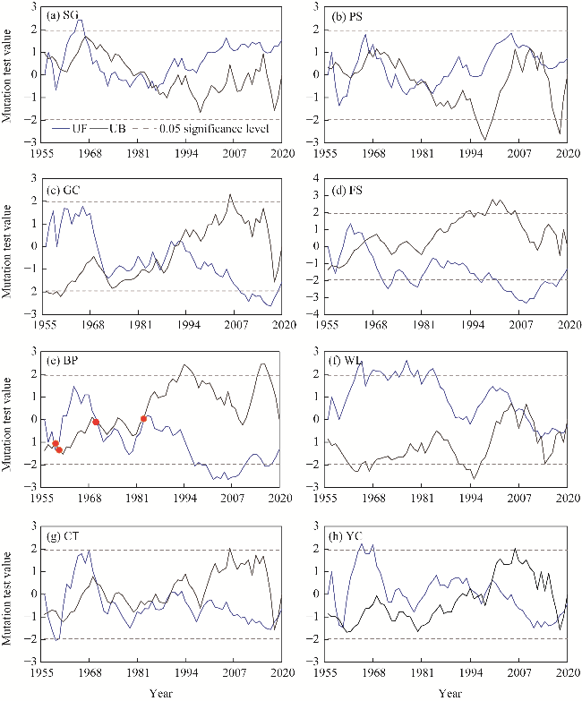 Fig. S1 Mann-Kendall mutation test results of runoff for eight hydrological stations. (a), SG (Shigu); (b), PS (Pingshan); (c), GC (Gaochang); (d), FS (Fushun); (e), BB (Beibei); (f), WL (Wulong); (g), CT (Cuntan); (h), YC (Yichang). The abbreviations are the same in the following figure. |