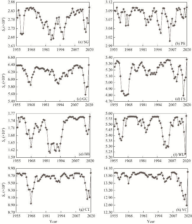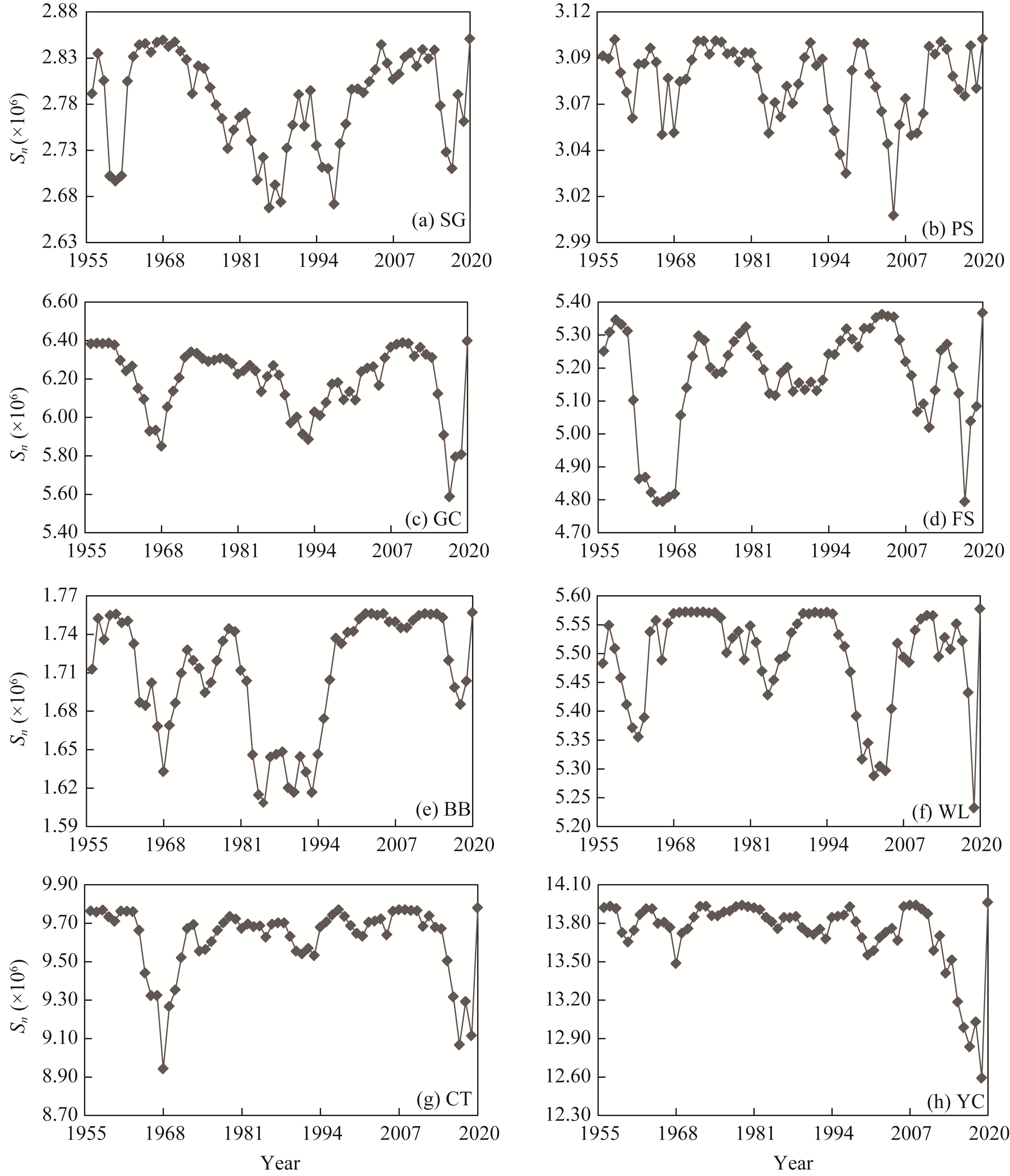 Fig. S2 Runoff ordered clustering test results for eight hydrological stations. (a), SG; (b), PS;(c), GC; (d), FS; (e), BB; (f), WL; (g), CT; (h), YC. Sn is the total sum of squared deviation. |