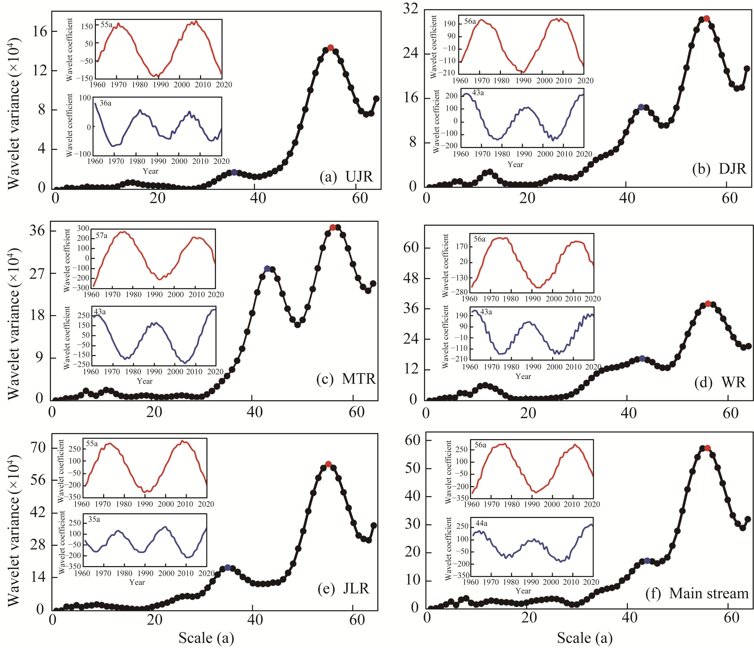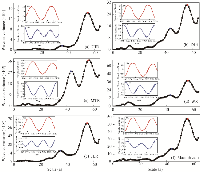 Fig. 5 Wavelet variance curves and wavelet coefficient curves of precipitation in different main periods of UJR (a), DJR (b), MTR (c), JLR (d), WR (e), and main stream (f) of the upper reaches the Yangtze River basin. Red line is the real part curve of the first main period, and blue line corresponds to the second main period. |