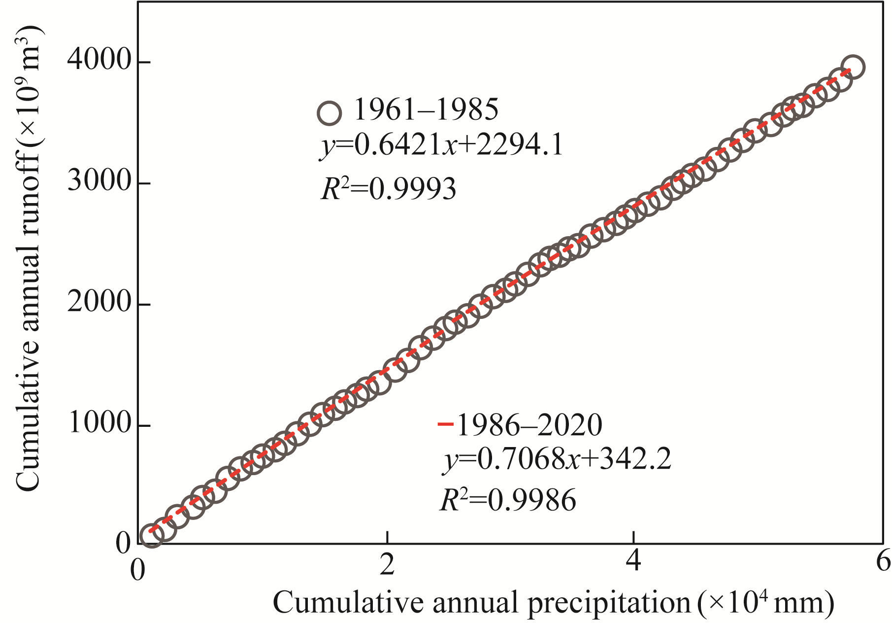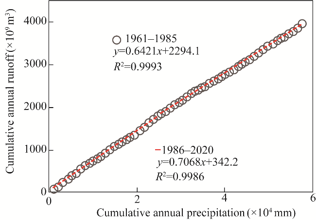 Fig. 6 Double mass curve between cumulative annual precipitation and annual runoff in JLR |
