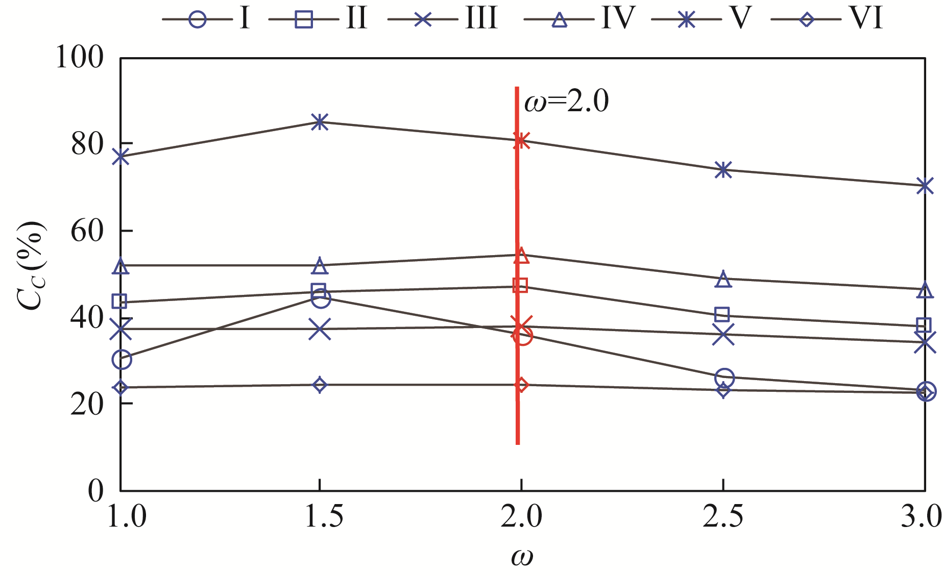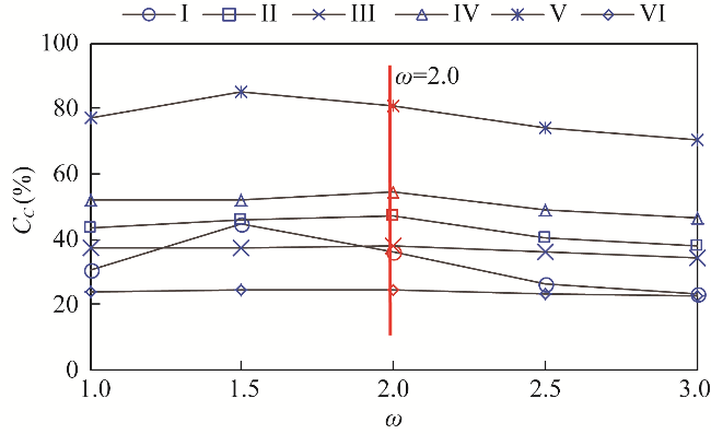 Fig. 7 Parameter sensitivity in Budyko hypothesis method of UJR (I), DJR (II), MTR (III), JLR (IV), WR (V), and main stream (VI) of the upper reaches of the Yangtze River basin. CC is the contribution of climate changes to runoff, and ω is the plant-available water coefficient. |