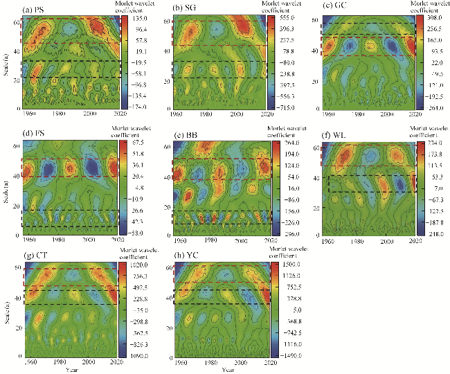 Fig. 4 Morlet wavelet coefficients of runoff of eight hydrological stations. (a), PS; (b), SG; (c), GC; (d), FS; (e), BB; (f), WL; (g), CT; (h), YC. Red dotted box shows the first main period, and black dotted box shows the second main period. |