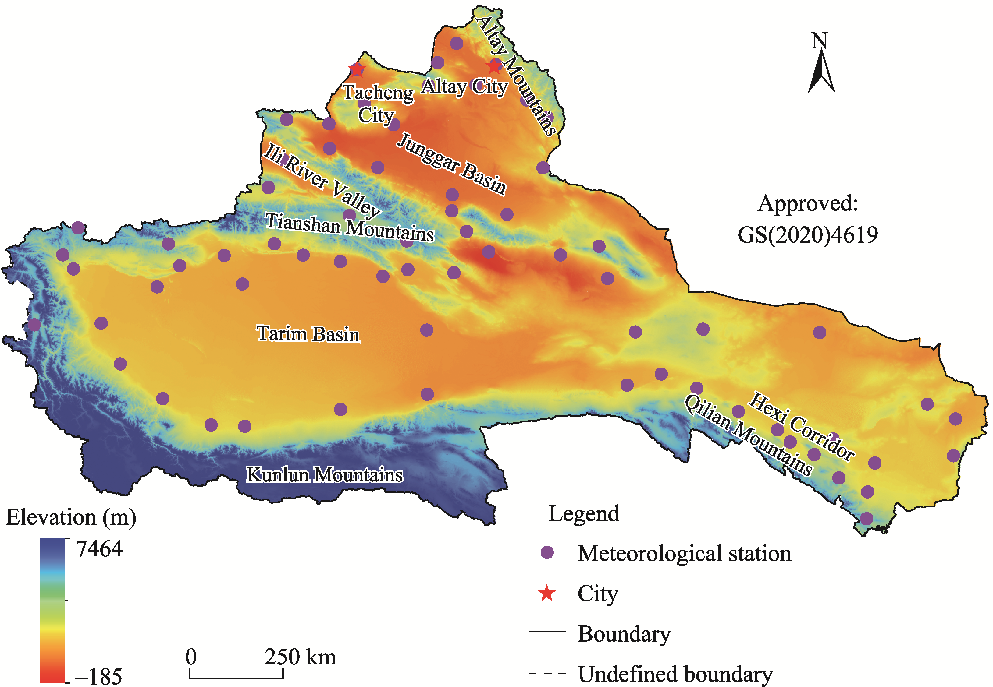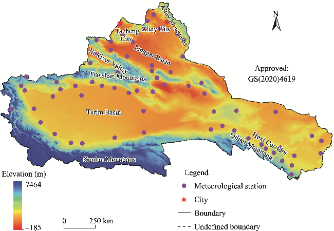 Fig. 1 Overview of the arid region of Northwest China (ARNC) based on the digital elevation model (DEM). DEM data were obtained from Hydrological data and maps based on SHuttle Elevation Derivatives at multiple Scales (HydroSHEDS) (https://hydrosheds.org/downloads). Tacheng City is the administration center of Tacheng Prefecture in Xinjiang Uygur Autonomous Region and Altay City is the administration center of Altay Prefecture. Note that the figure is based on the standard map (GS(2020)4619) of the Map Service System (https://bzdt.ch.mnr.gov.cn/), and the standard map has not been modified. |