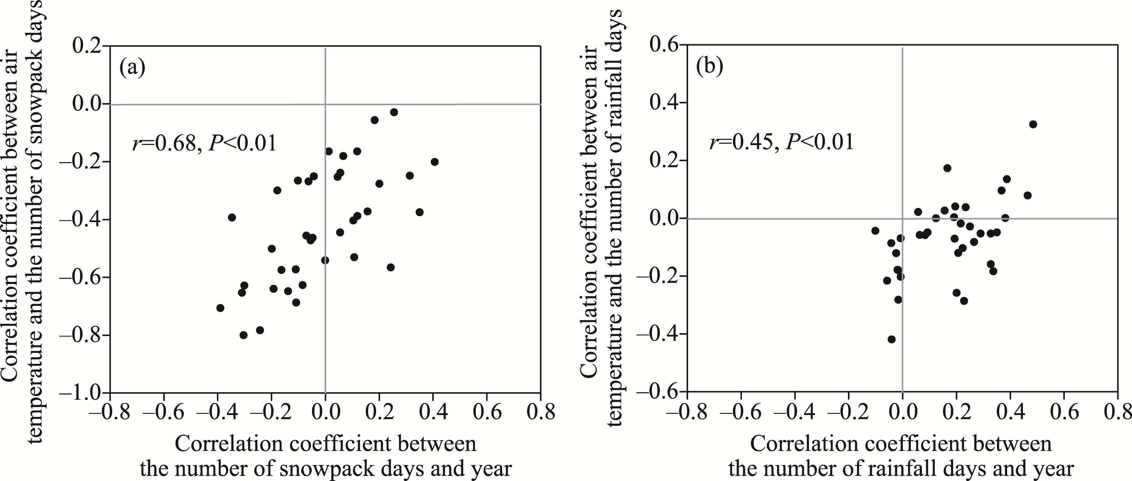 Fig. 10 Correlations between the trend in the number of snowpack days (indicated by the correlation between the number of snowpack days and year) and the correlation of air temperature with the number of snowpack days (a) as well as between the trend in the number of rainfall days (indicated by the correlation between the number of rainfall days and year) and the correlation of air temperature with the number of rainfall days (b). Data points correspond to 38 meteorological stations with ROS events occurring in at least 5 a. |