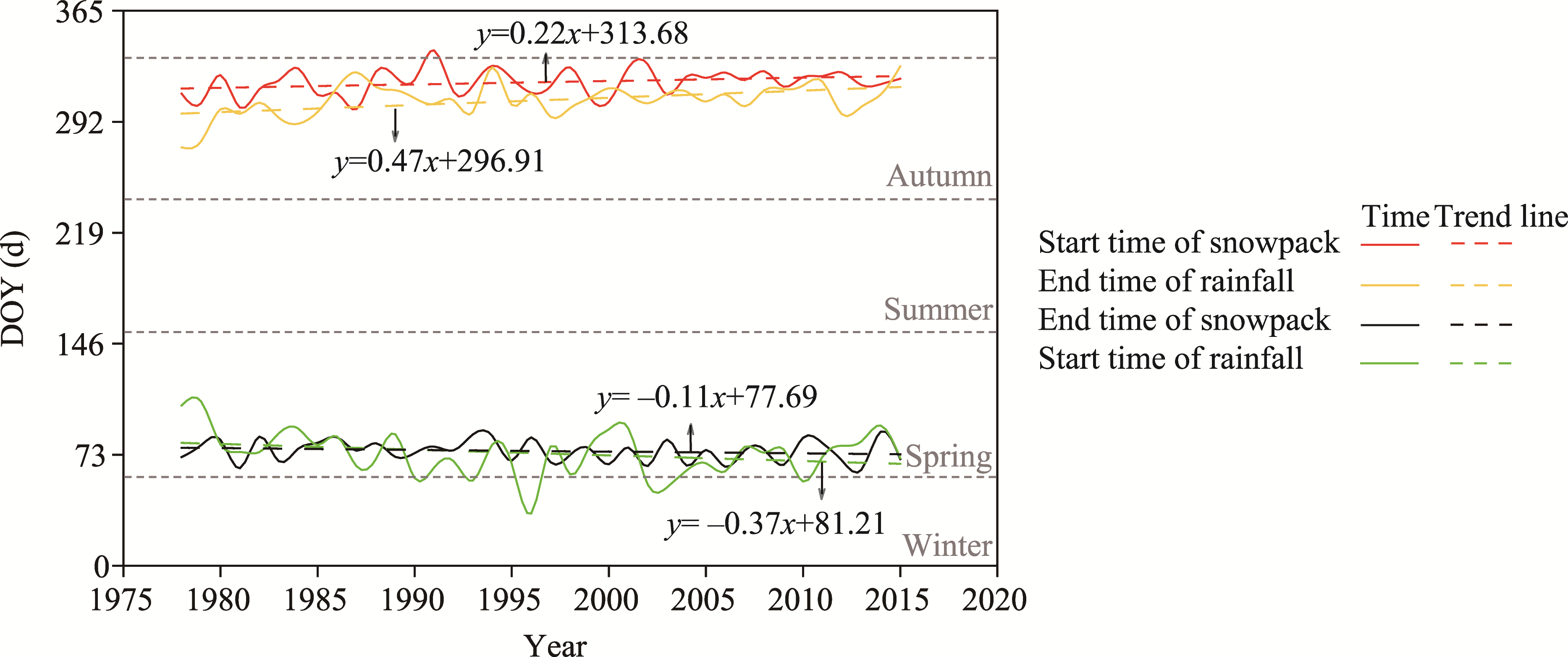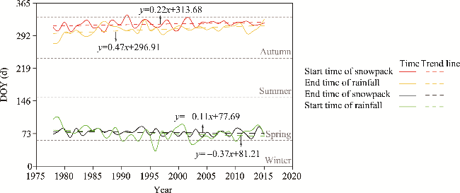 Fig. 11 Trends in the start time and end time of rainfall and snowpack in the ARNC from 1978 to 2015. DOY, day of the year. The dotted gray lines in the figure indicate the time boundaries of the four seasons. |
