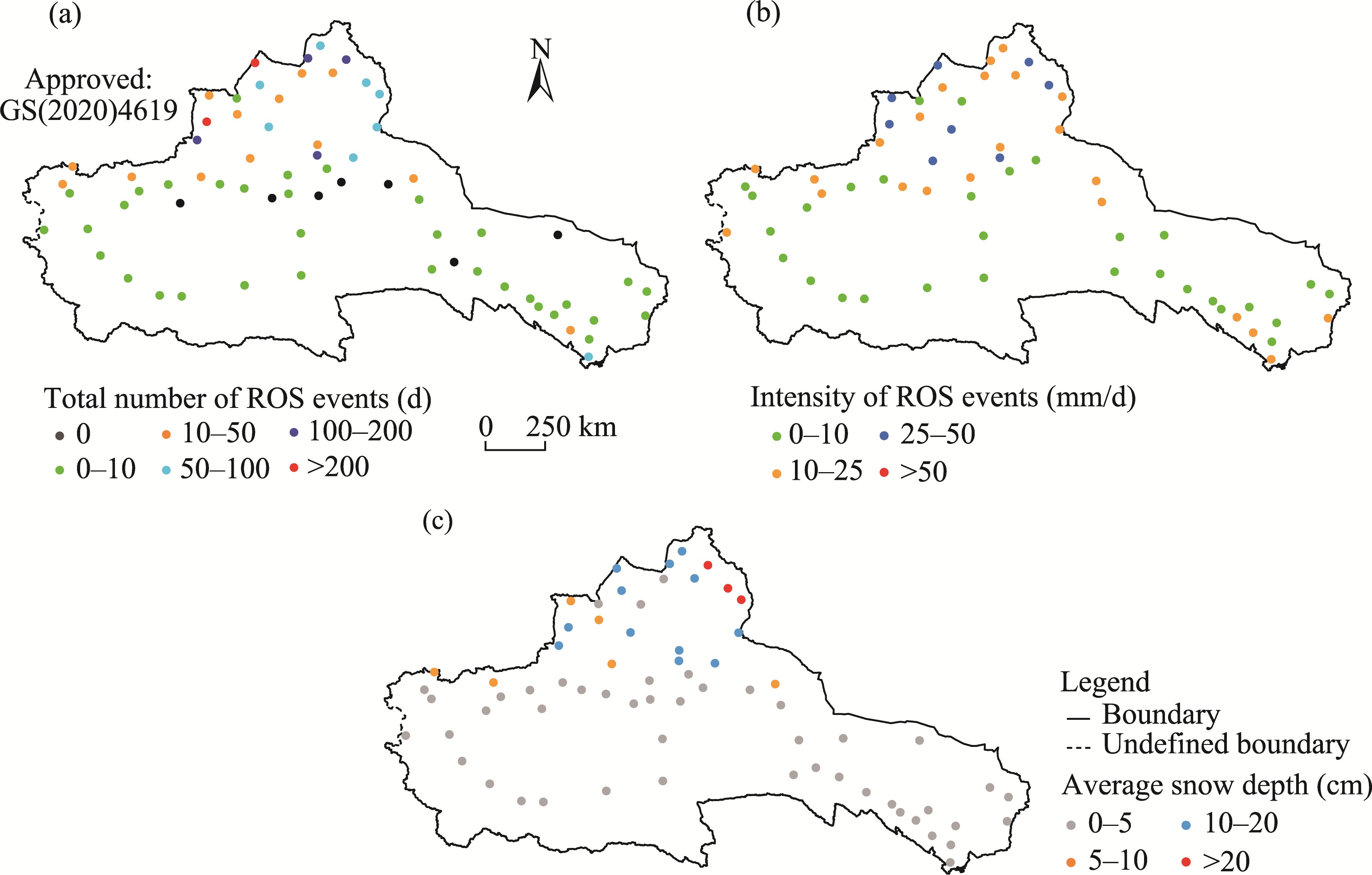 Fig. 2 Spatial distribution of the total number of rain-on-snow (ROS) events (a), intensity of ROS events (b), and average snow depth (c) in the ARNC during 1978-2015. Note that the figures are based on the standard map (GS(2020)4619) of the Map Service System (https://bzdt.ch.mnr.gov.cn/), and the standard map has not been modified. |
