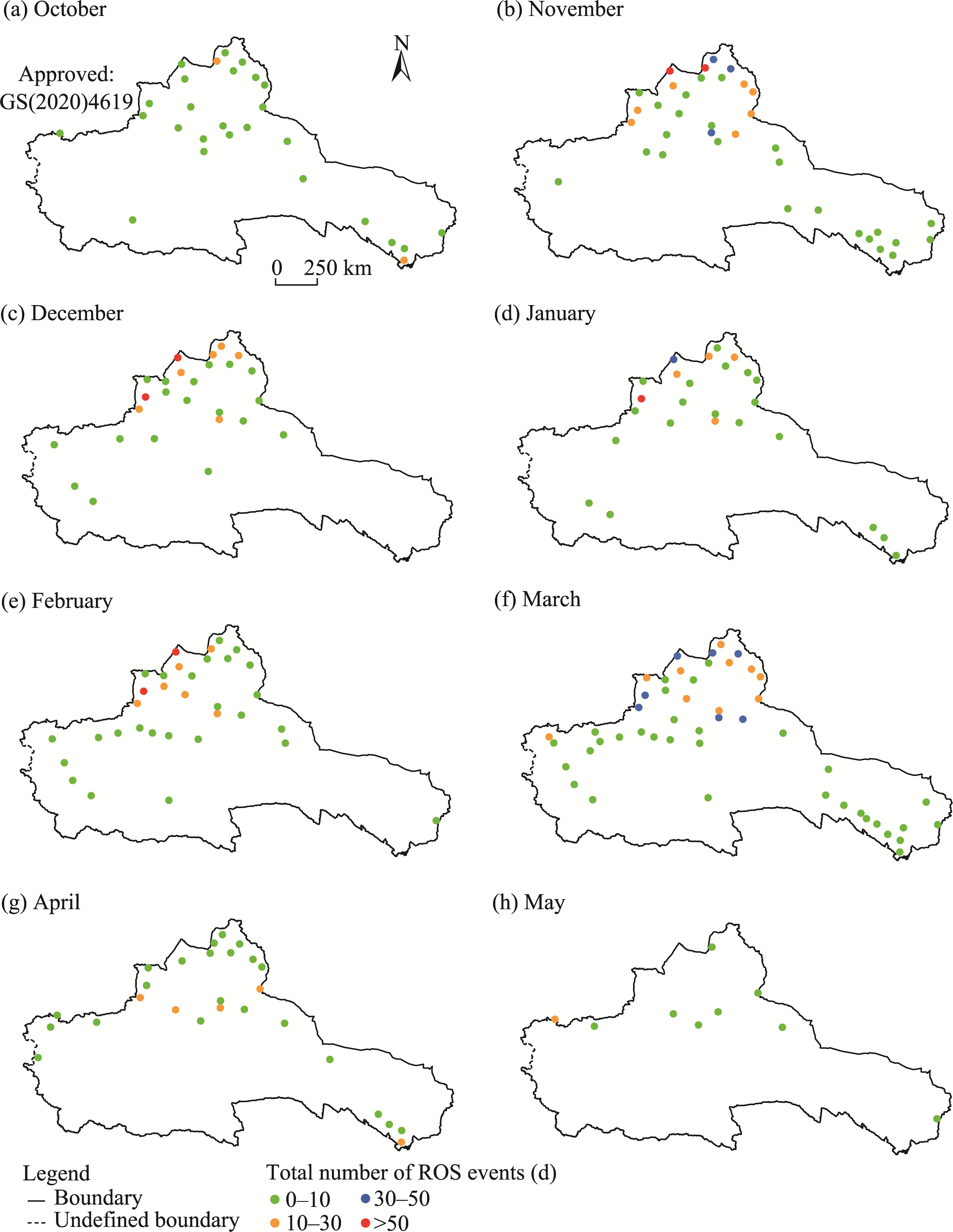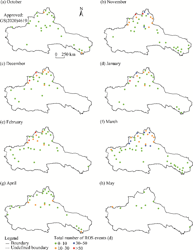 Fig. 3 Spatial distribution of the total number of ROS events in October (a), November (b), December (c), January (d), February (e), March (f), April (g), and May (h) in the ARNC during 1978-2015. Stations without ROS events from 1978 to 2015 are not shown in the figure. Note that the figures are based on the standard map (GS(2020)4619) of the Map Service System (https://bzdt.ch.mnr.gov.cn/), and the standard map has not been modified. |