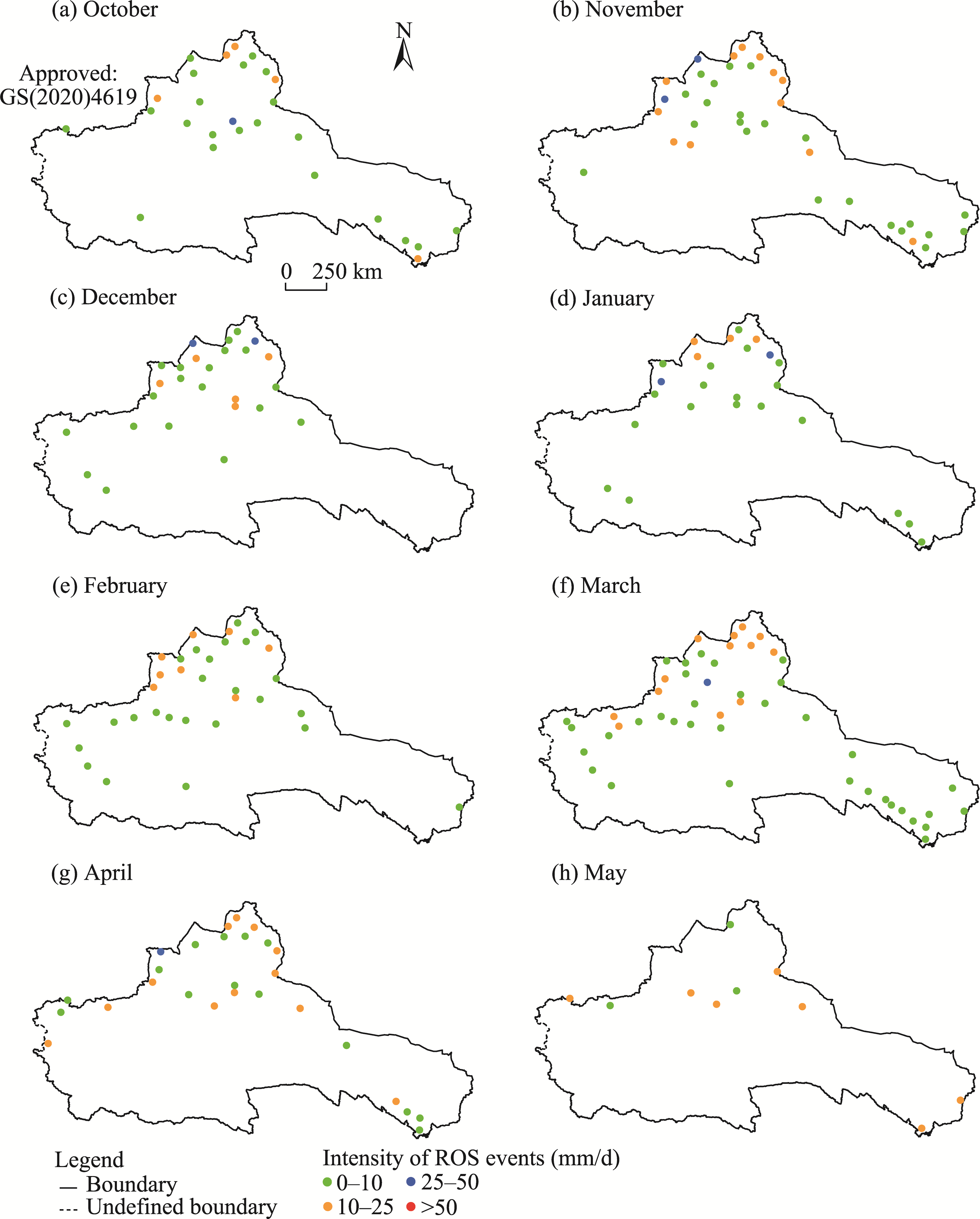 Fig. 4 Spatial distribution of the intensity of ROS events in October (a), November (b), December (c), January (d), February (e), March (f), April (g), and May (h) in the ARNC during 1978-2015. Stations without ROS events from 1978 to 2015 are not shown in the figures. Note that the figures are based on the standard map (GS(2020)4619) of the Map Service System (https://bzdt.ch.mnr.gov.cn/), and the standard map has not been modified. |