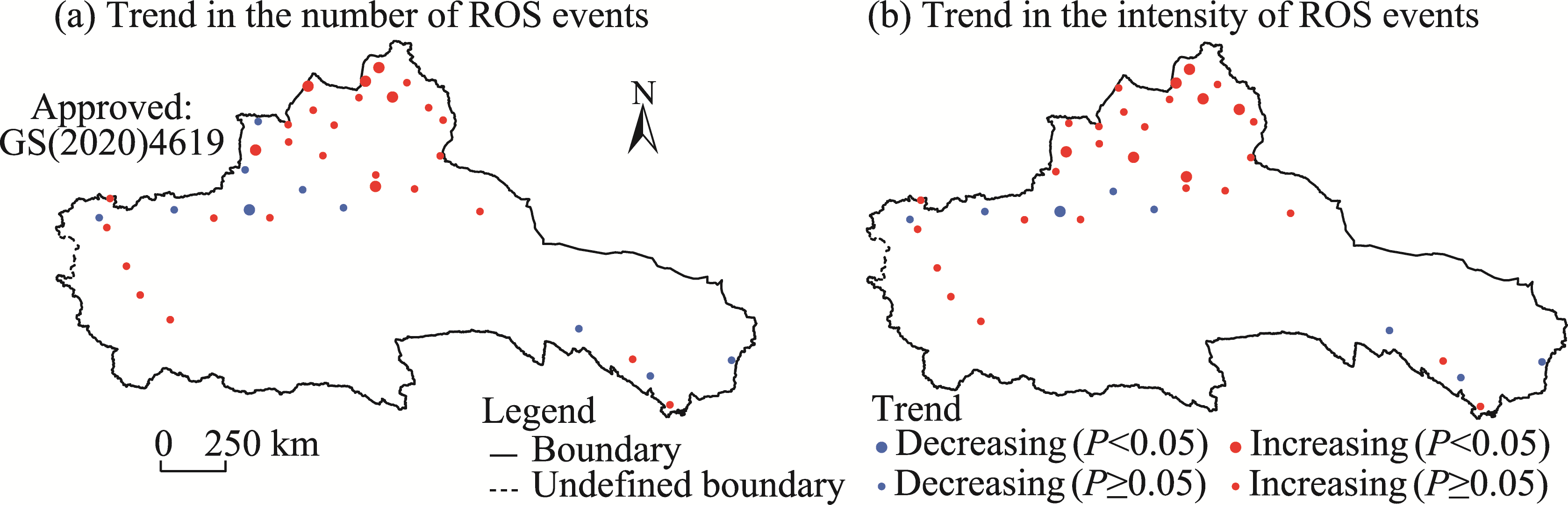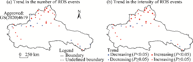 Fig. 5 Trends in the number (a) and intensity (b) of ROS events at 38 meteorological stations in the ARNC during 1978-2015. The 38 stations have ROS events occurring at least 5 a. Note that the figures are based on the standard map (GS(2020)4619) of the Map Service System (https://bzdt.ch.mnr.gov.cn/), and the standard map has not been modified. |