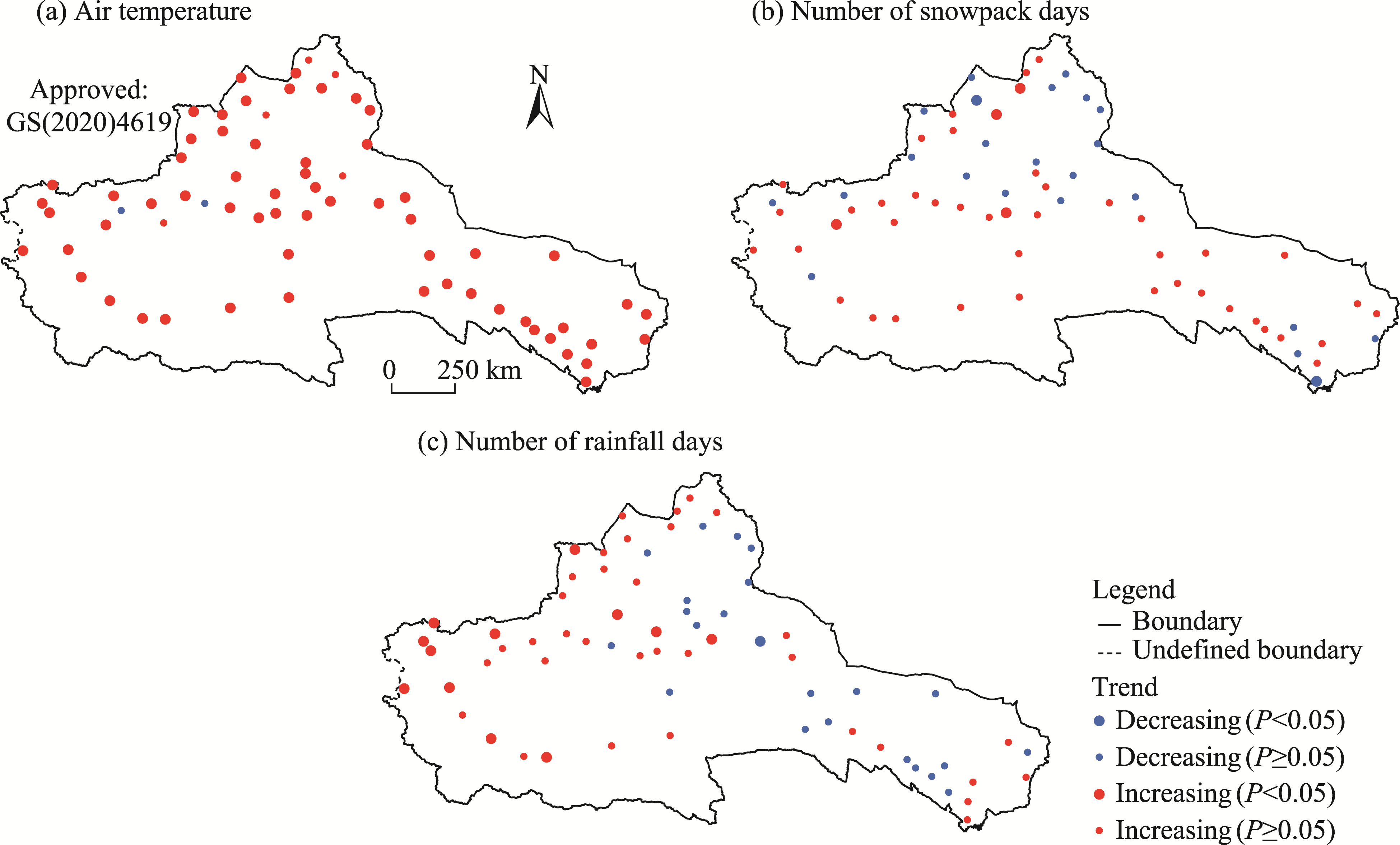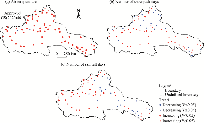 Fig. 6 Trends in air temperature (a), number of snowpack days (b), and number of rainfall days (c) at 68 meteorological stations in the ARNC during 1978-2015. Note that the figures are based on the standard map (GS(2020)4619) of the Map Service System (https://bzdt.ch.mnr.gov.cn/), and the standard map has not been modified. |