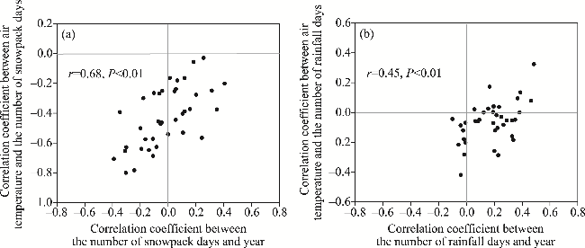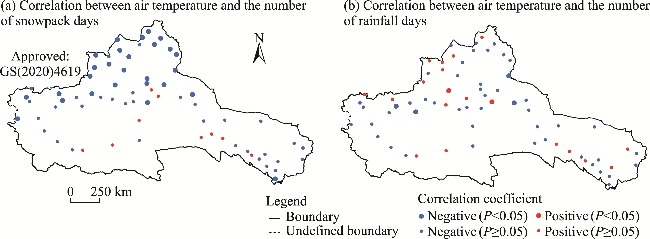 Fig. 9 Correlations of air temperature with the number of snowpack days (a) and the number of rainfall days (b) at 68 meteorological stations in the ARNC. Note that the figures are based on the standard map (GS(2020)4619) of the Map Service System (https://bzdt.ch.mnr.gov.cn/), and the standard map has not been modified. |