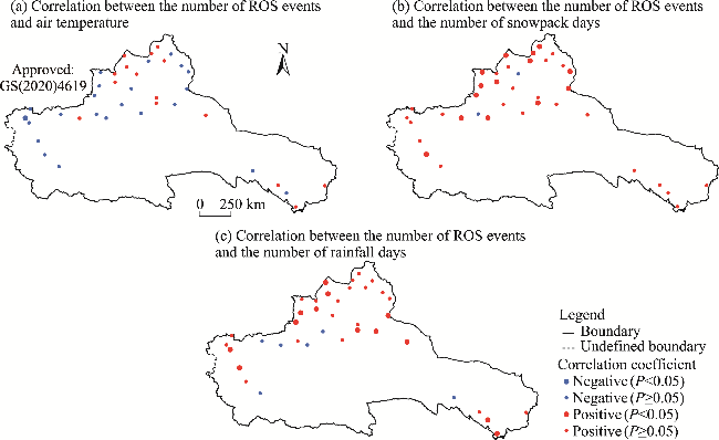 Fig. 7 Correlations of the number of ROS events with air temperature (a), the number of snowpack days (b), and the number of rainfall days (c) at 38 meteorological stations in the ARNC. The 38 stations have ROS events occurring at least 5 a. Note that the figures are based on the standard map (GS(2020)4619) of the Map Service System (https://bzdt.ch.mnr.gov.cn/), and the standard map has not been modified. |