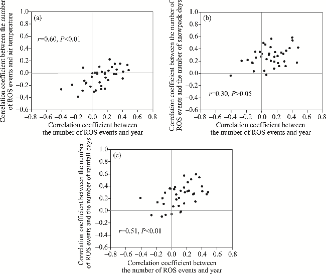 Fig. 8 Correlations between the trend in ROS events (indicated by the correlation between the number of ROS events and year) and the correlation of the number of ROS events with air temperature (a), the number of snowpack days (b), and the number of rainfall days (c). Data points correspond to 38 meteorological stations with ROS events occurring in at least 5 a. |