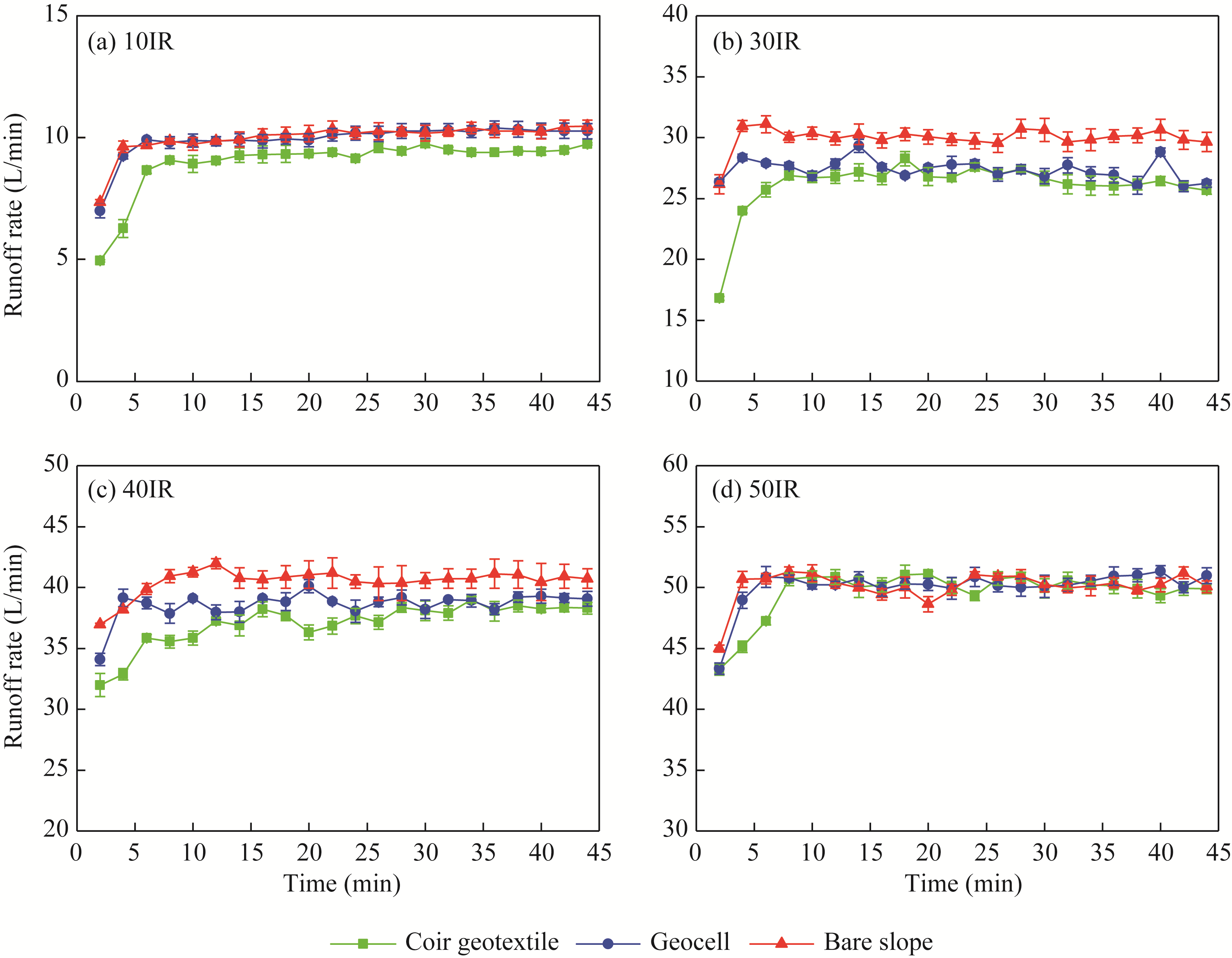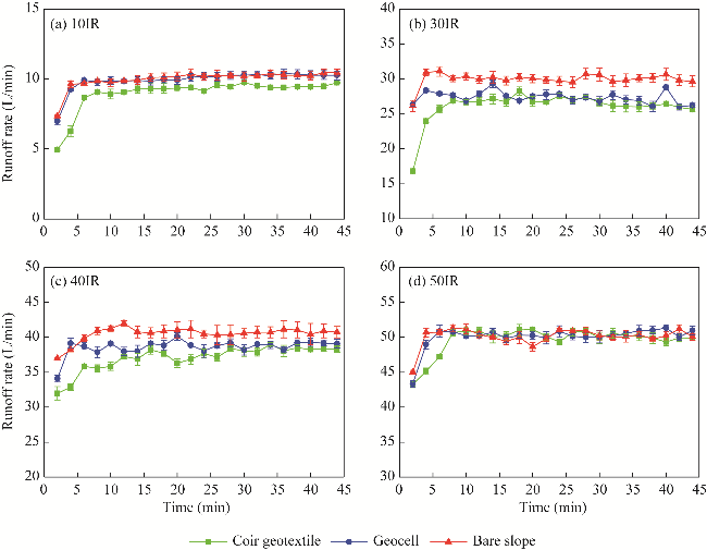 Fig. 5 Variation in runoff rate under different treatments. (a), 10IR (10 L/min inflow rate); (b), 30IR (30 L/min inflow rate); (c), 40IR (40 L/min inflow rate); (d), 50IR (50 L/min inflow rate). Bars are standard errors. |