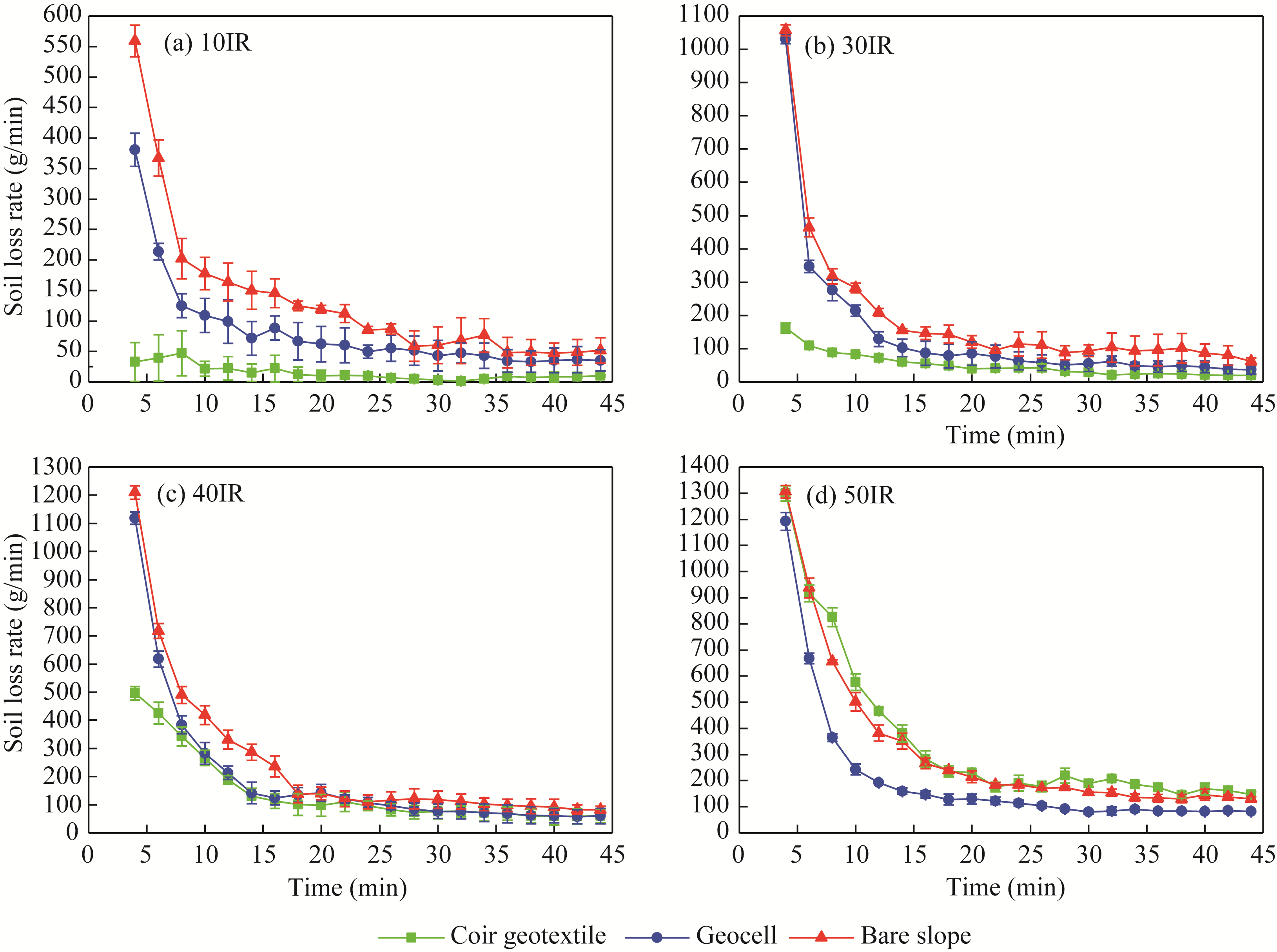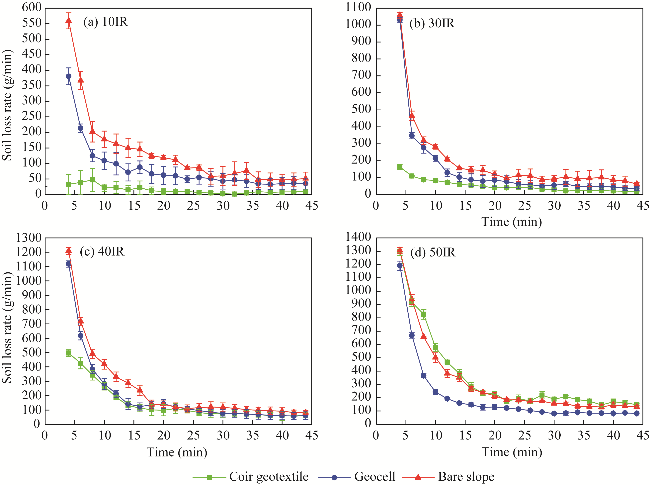 Fig. 6 Variation in soil loss rate under different treatments. (a), 10IR (10 L/min inflow rate); (b), 30IR (30 L/min inflow rate); (c), 40IR (40 L/min inflow rate); (d), 50IR (50 L/min inflow rate). Bars are standard errors. |