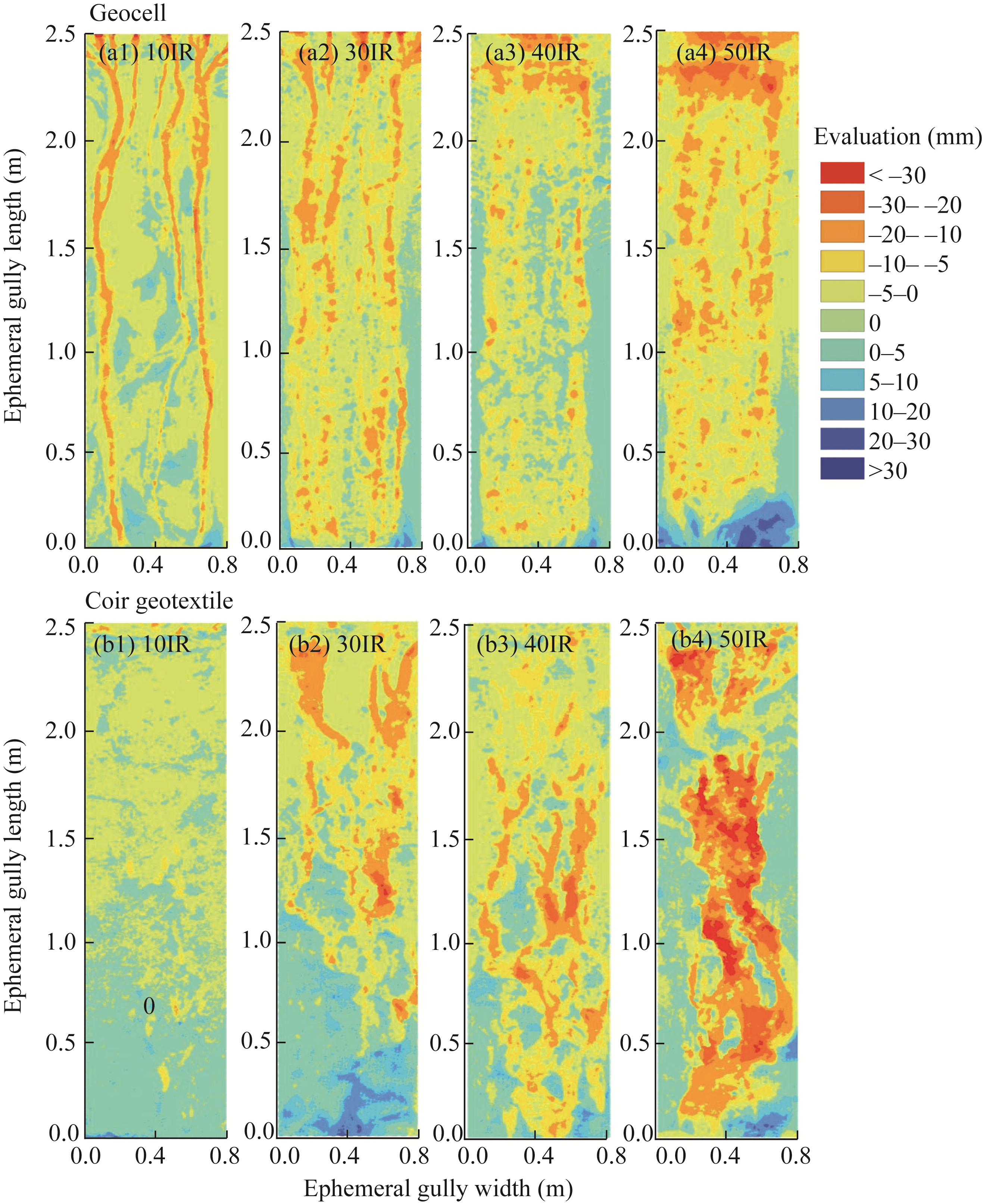 Fig. 7 Microtopography change under geocell (a1-a4) and coir geotextile (b1-b4) treatments. 10IR, 10 L/min inflow rate; 30IR, 30 L/min inflow rate; 40IR, 40 L/min inflow rate; 50IR, 50 L/min inflow rate. |