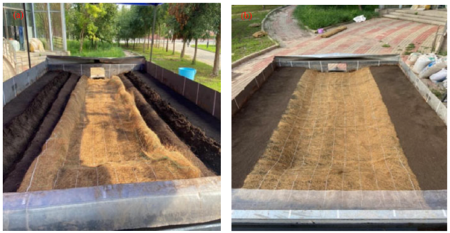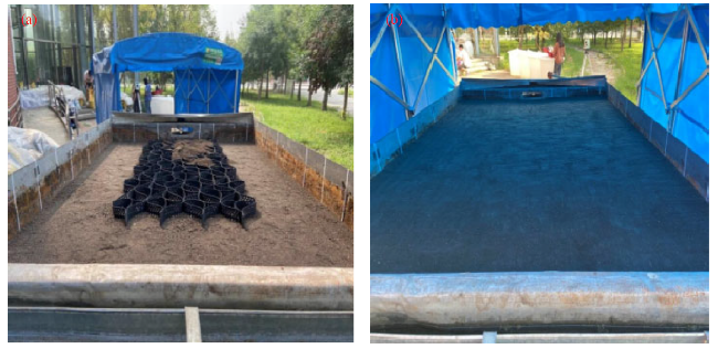 Fig. 1 An illustration of the experimental device. Coir geotextile is made of coconut fiber and a protective net through mechanical processing. Blanket weight is 334 g/m2, thickness is approximately 3.0-5.0 mm, longitudinal breaking strength is 2.0 kN/m, and transverse breaking strength is 1.9 kN/m. Geocell is made of high density polyethylene material, solder joint peel strength is >3000 N, thickness is 1.3 mm, and height is 60.0 mm. |
