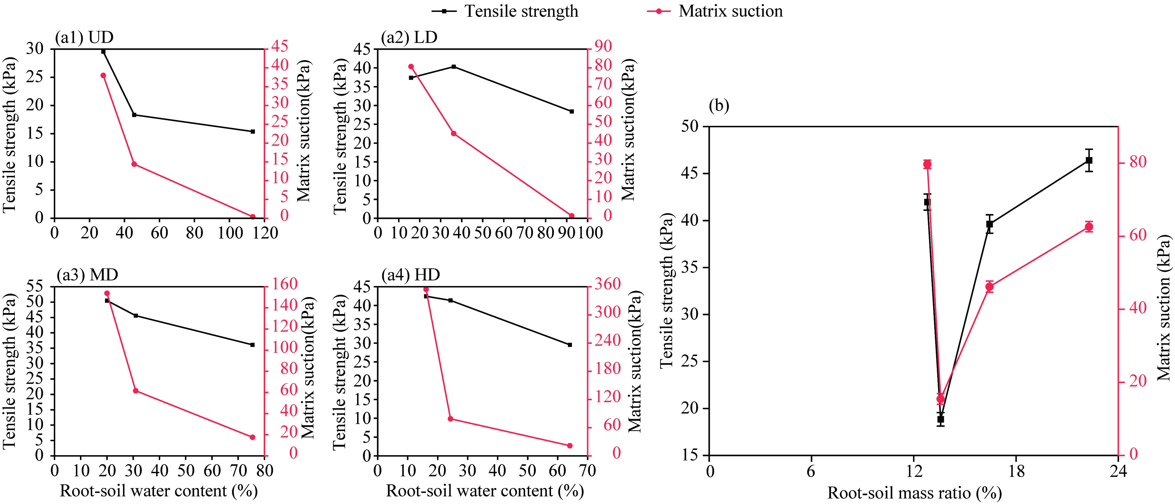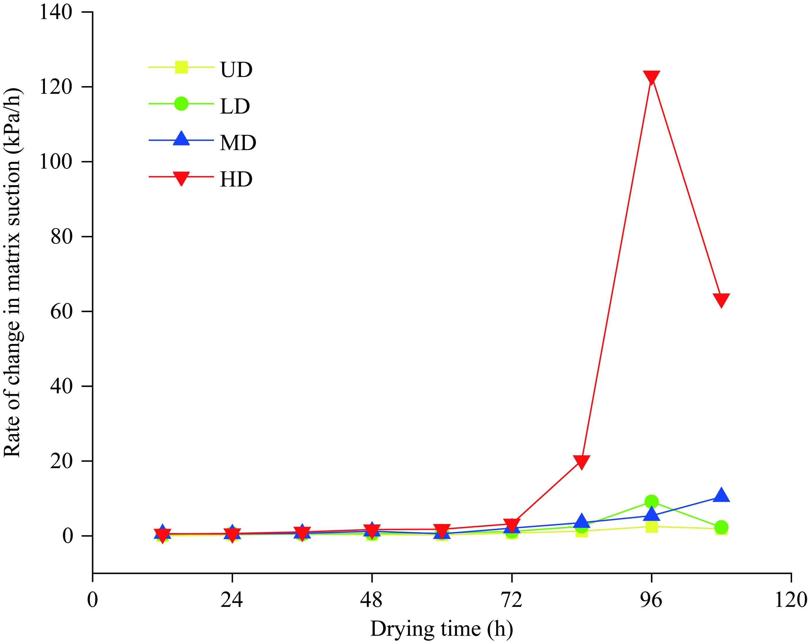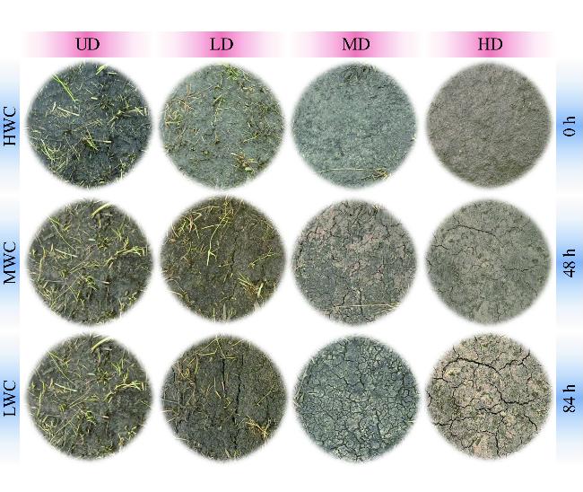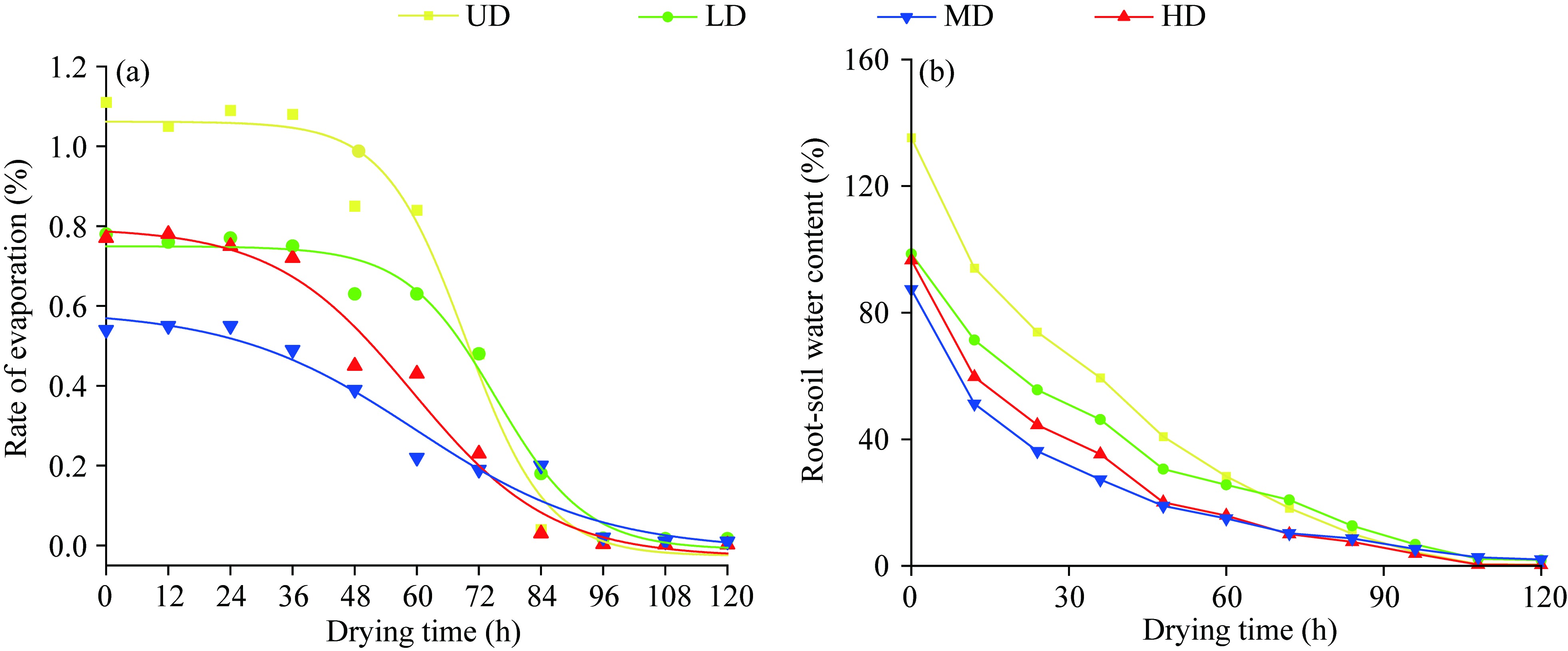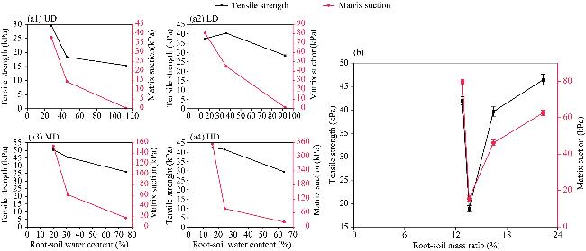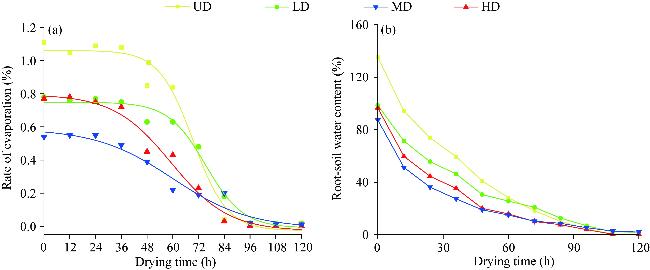 Fig. 4 Evaporation rate curve (a) and water content curve (b) of root-soil composite sample determined by this study. UD, undegraded; LD, lightly degraded; MD, moderately degraded; HD, highly degraded. |