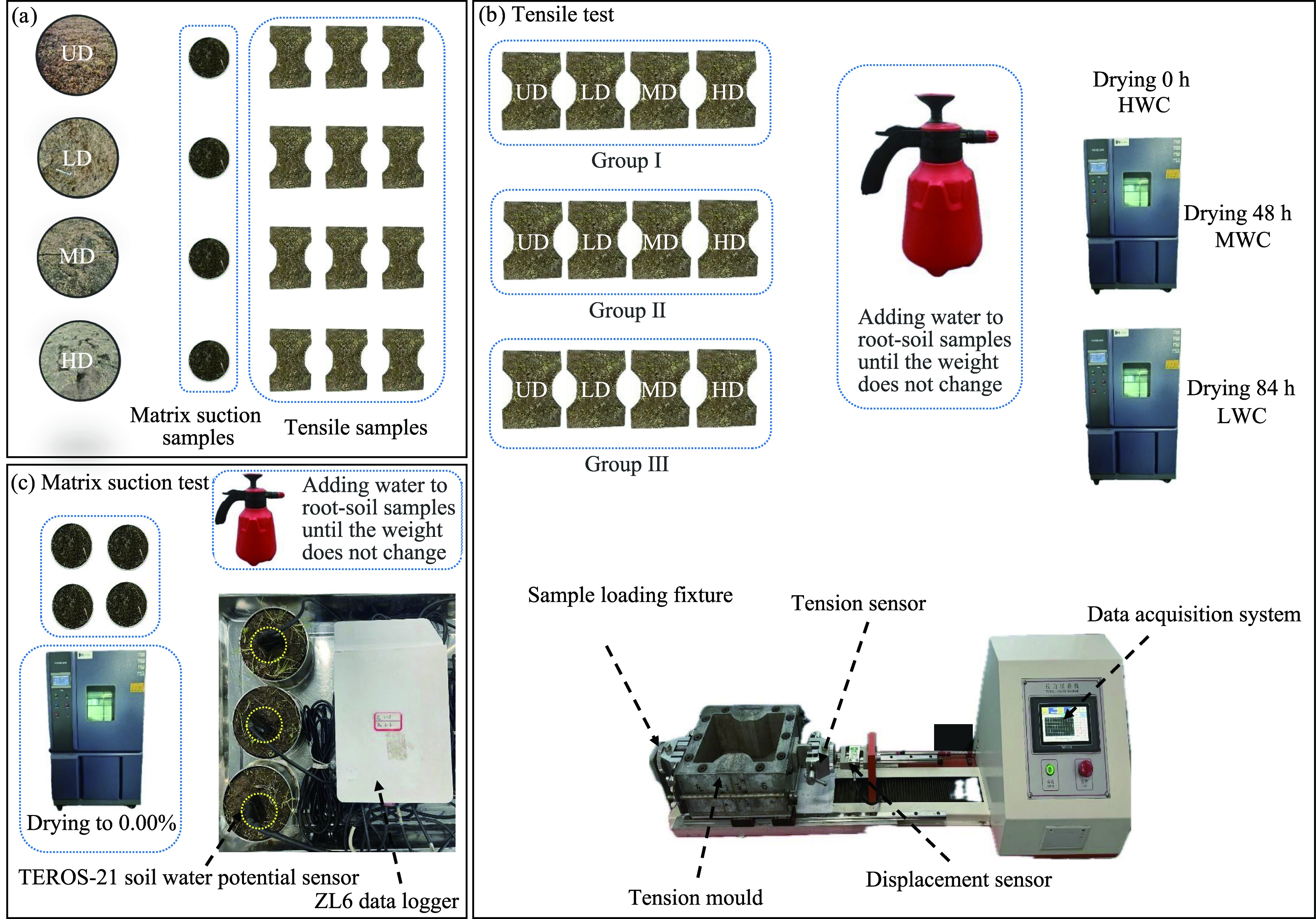 Fig. 5 Schematic diagram of test process. (a), field sampling; (b), drying experiment and tensile test; (c), matrix suction test. HWC, high water content; MWC, medium water content; LWC, low water content. |