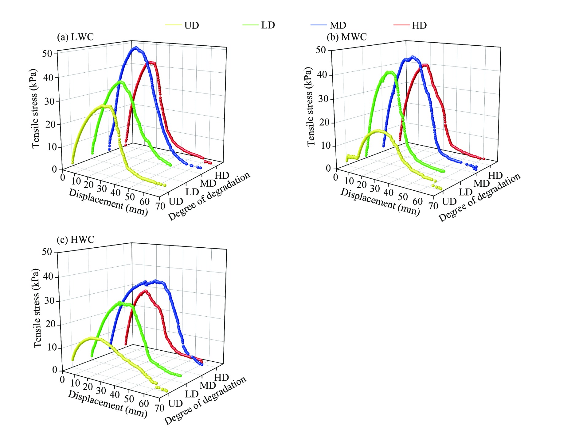 Fig. 6 Tensile stress-displacement curve of root-soil composite under different water content gradients. (a), LWC; (b), MWC; (c), HWC. |