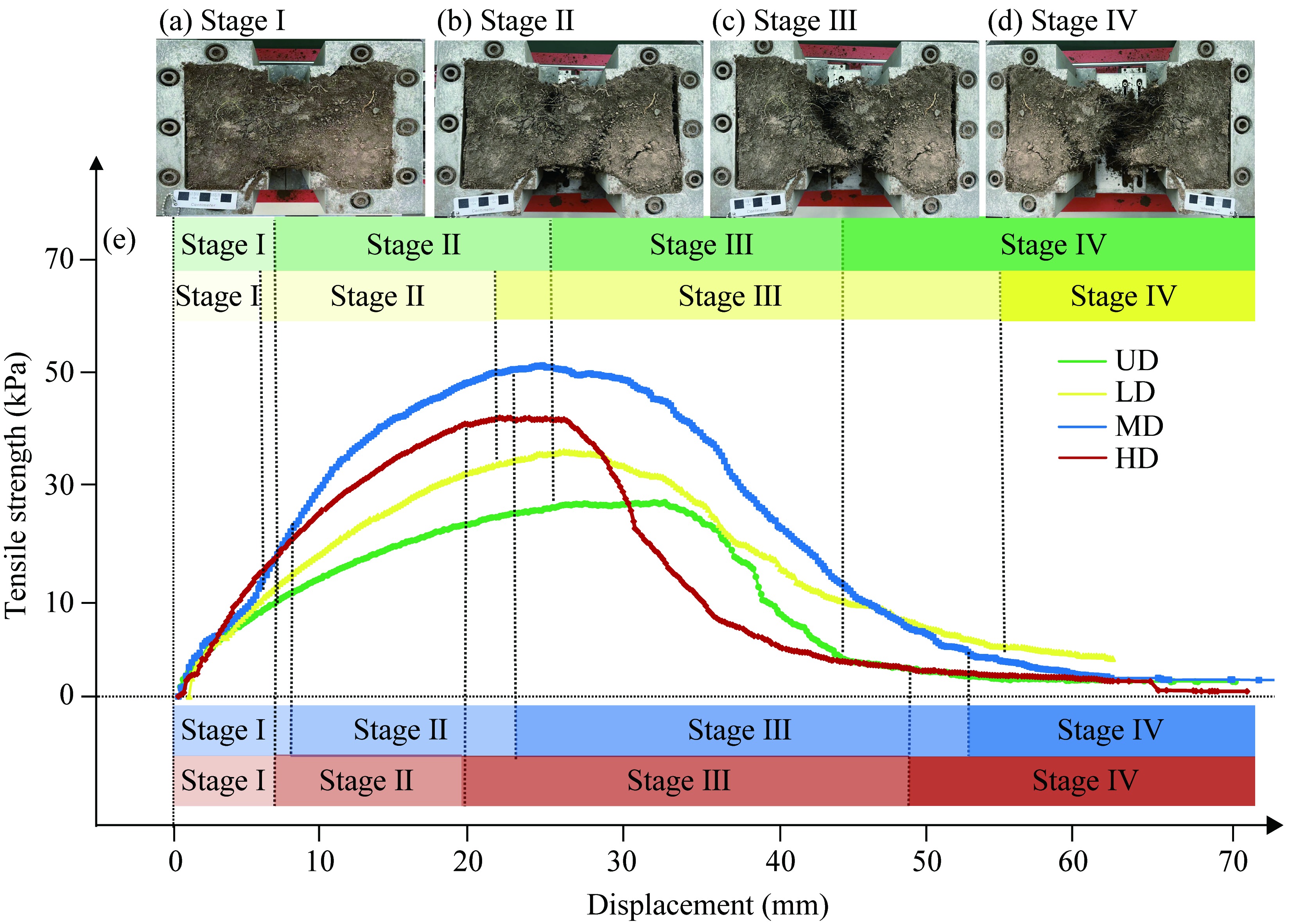 Fig. 7 Stage classification diagram of tensile stress-displacement curve under LWC condition. (a), elastic deformation stage (Stage I); (b), elastic-plastic deformation stage (Stage II); (c), root fracturing and local soil failure stage (Stage III); (d), overall failure stage (Stage IV); (e), tensile stress-displacement curve. |