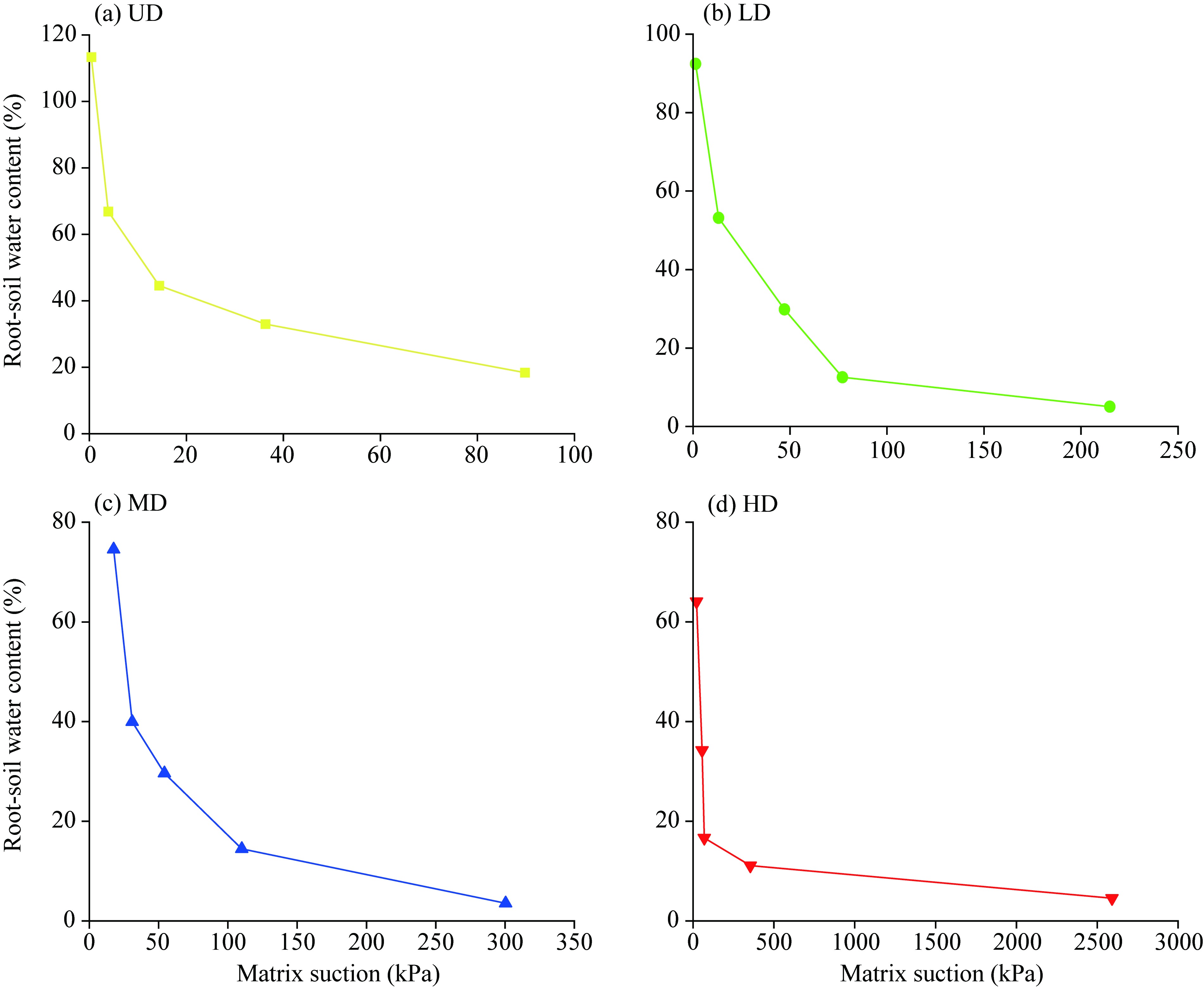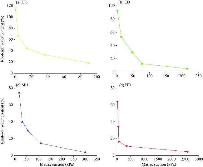 Fig. 8 Matrix suction characteristic curve of root-soil composite with different degrees of degradation. (a), UD; (b), LD; (c), MD; (d), HD. |