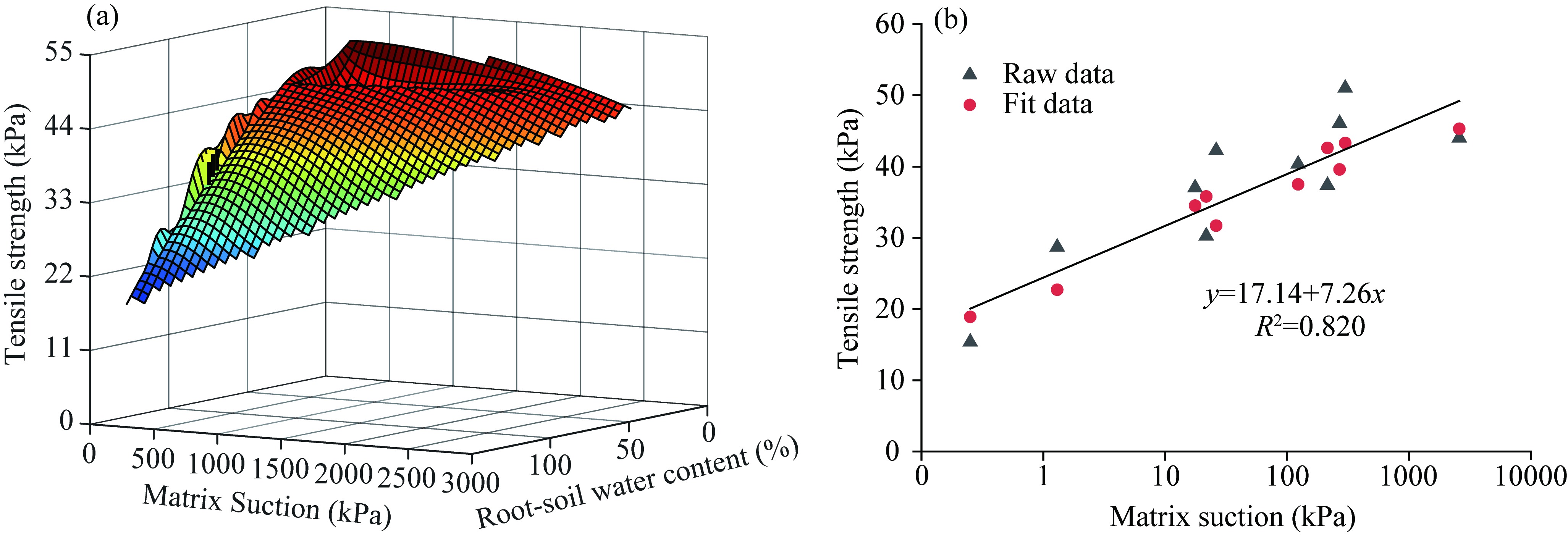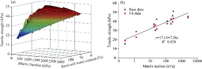 Fig. 10 Relationship among root-soil water content, matrix suction and tensile strength. (a), fitting surface diagram; (b), simulation formula between tensile strength and matrix suction. |