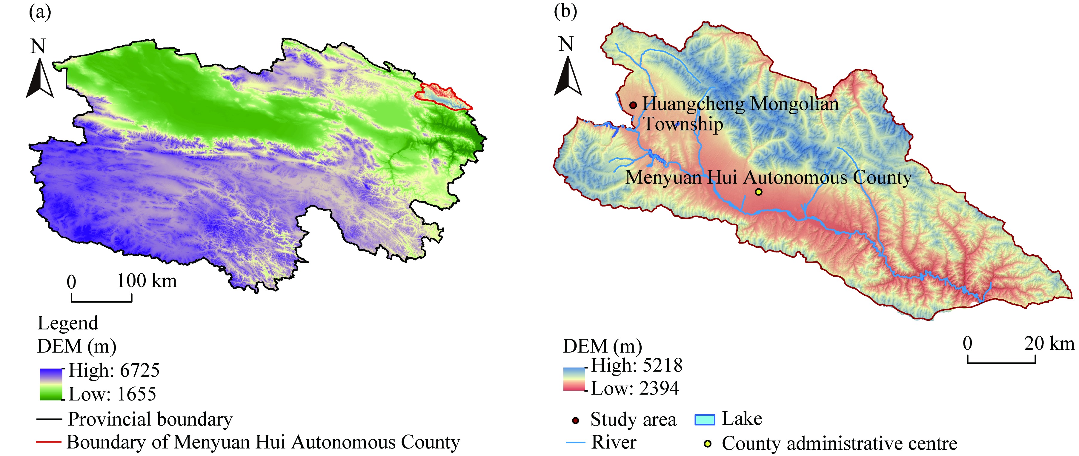Fig. 1 Location of Menyuan Hui Autonomous County in Qinghai Province (a) and location of the study area in Huangcheng Mongolian Township, Menyuan Hui Autonomous County (b). DEM, digital elevation model. |
