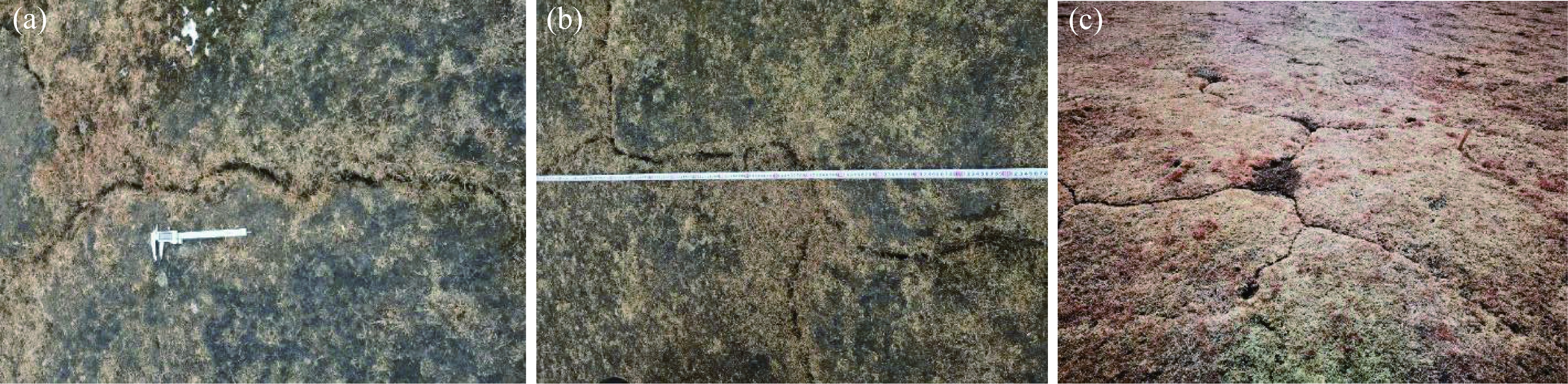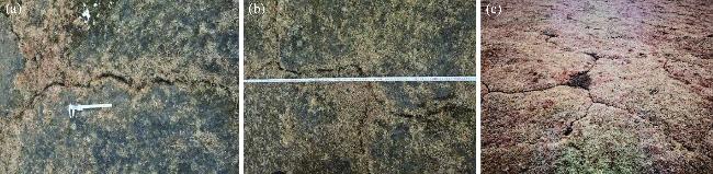 Fig. 2 Developmental morphological of surface cracks in alpine meadows. (a), linear fracture; (b), dendritic fracture; (c), polygonal fracture. |