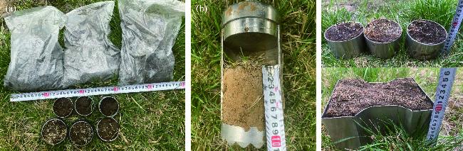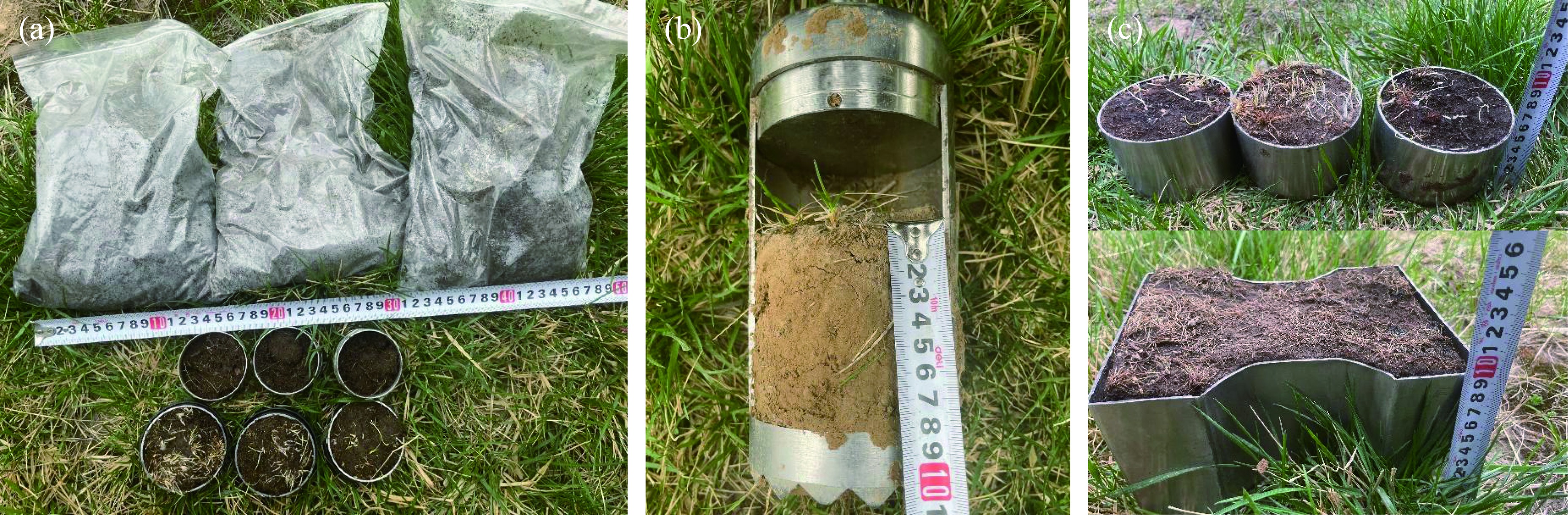 Fig. 3 Field sampling. (a), soil physical properties samples; (b), plant root parameters; (c), tensile and matrix suction samples. |