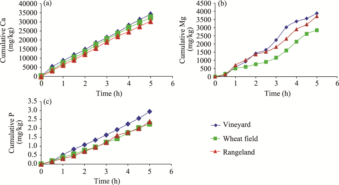 Fig. 3 Kinetics curve of Ca (a), Mg (b), and P (c) release from soil in different cultivation lands |