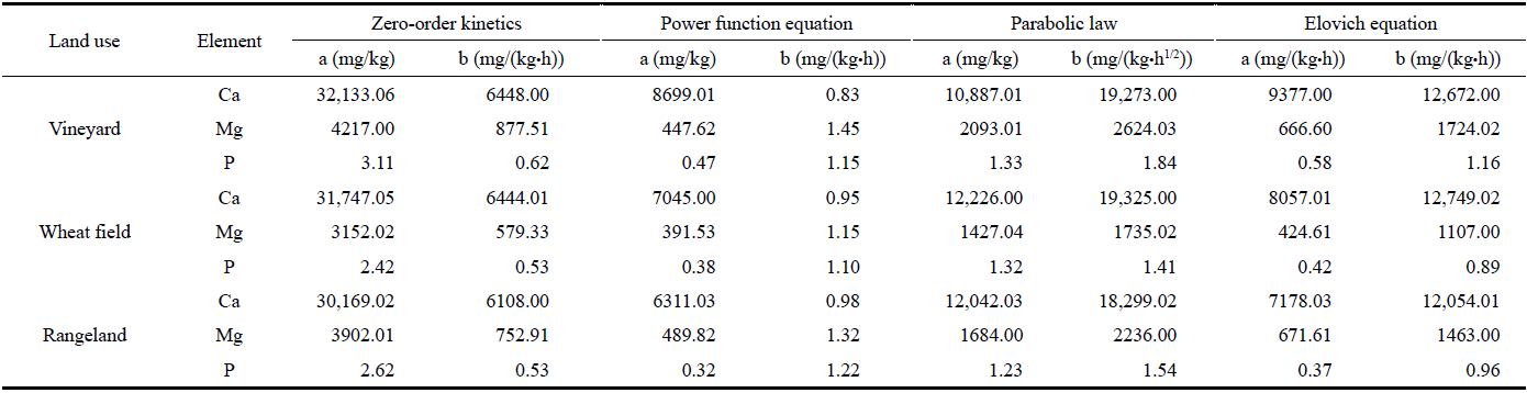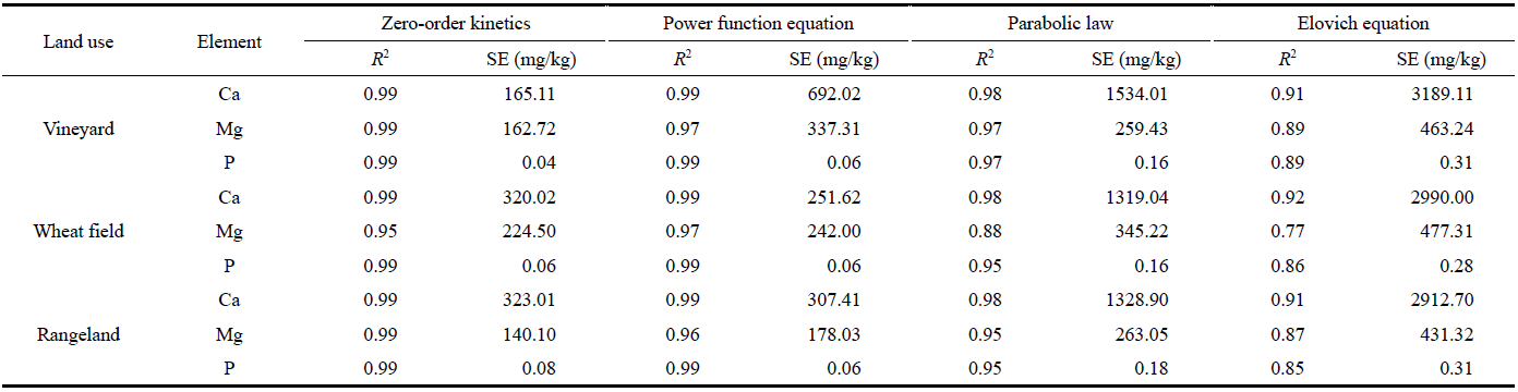 Table 6 Coefficient of determination (R2) and standard error (SE) of estimation for kinetic equations used to assess the release rates of Ca, Mg, and P with wood vinegar extractant in different cultivation lands |