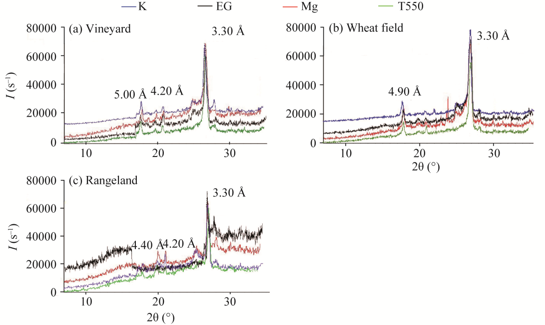 Fig. 4 X-ray diffraction graph for the soils sampled from vineyard (a), wheat field (b), and rangeland (c) after wood vinegar treatment. EG, ethylene glycol; T550, temperature at 550°C. |