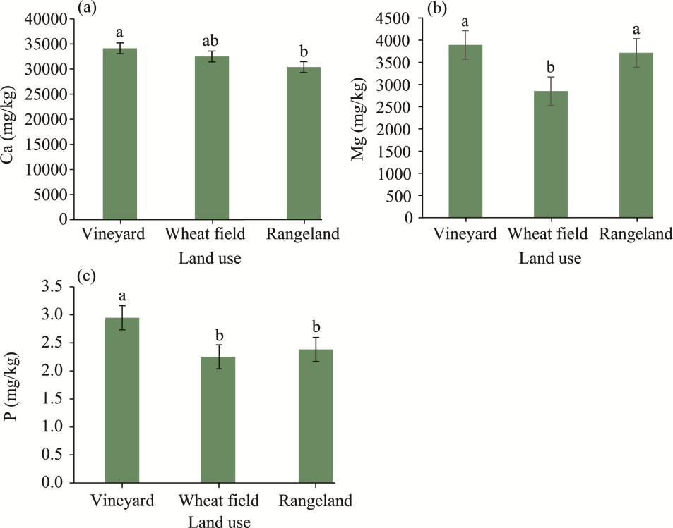 Fig. 2 Comparison of the average cumulative Ca (a), Mg (b), and P (c) released by wood vinegar in different cultivation lands. Ca, calcium; Mg, magnesium; P, phosphorus. Different lowercase letters indicate significant differences among different types of crop land at P<0.01 level. |