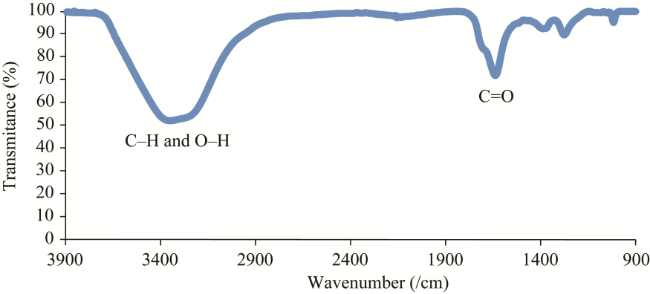 Fig. 1 Spectrum of the wood vinegar used in this study measured by Fourier-transform infrared spectroscopy (FTIR) |