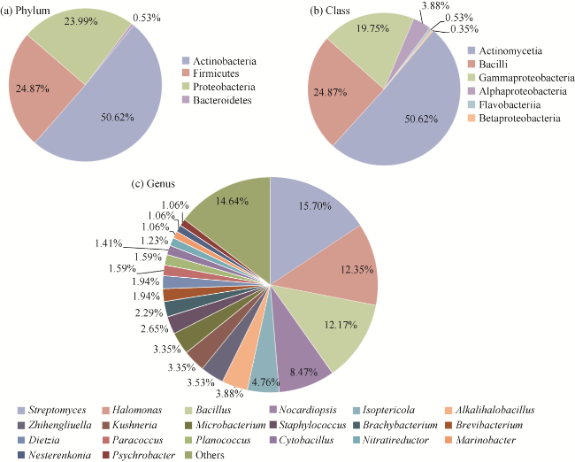 Fig. 1 Community composition of culturable bacteria from the three halophytes at phylum (a), class (b), and genus (c) (top 20 dominant genera) levels |