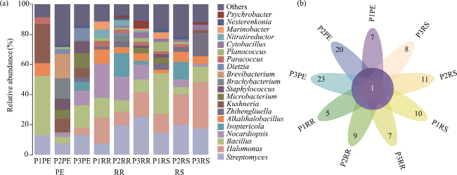 Fig. 2 Community composition at the genus level (top 20 dominant genera) (a) and flower diagram (b) at the species level of culturable bacteria isolated from different samples of the three halophytes (P1, P2, and P3). PE, RR, and RS indicate samples form root and shoot, rhizosphere soil, and bulk soil, respecitively. The detailed sample information is shown in Table 1. The abbreviations are the same in the following tables and figures. |