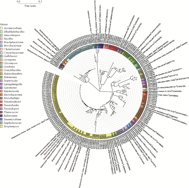 Fig. 3 Phylogenetic tree of potential novel bacterial strains. The effective sequence length was 538 bp. Bar, the number of substitutions per sample. |