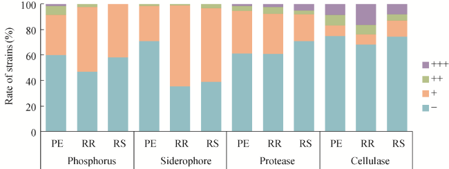 Fig. 5 Screening results in bacterial strains solubilizing phosphate, producing siderophores, protease, and cellulase. ''‒'' indicates negative solubilization ability (E=1); ''+'' indicates weak solubilization ability (1<E≤2); ''++'' indicates moderate solubilization ability (2<E≤3); and ''+++'' indicates strong solubilization ability (E>3). E is the ability to solubilize phosphate and produce siderophores, protease, and cellulose. |
