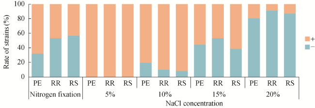 Fig. 6 Ability of nitrogen fixation and salt tolerance in bacterial strains. ''‒'' indicates negative and ''+'' indicates positive for nitrogen fixation and salt tolerance ability. |