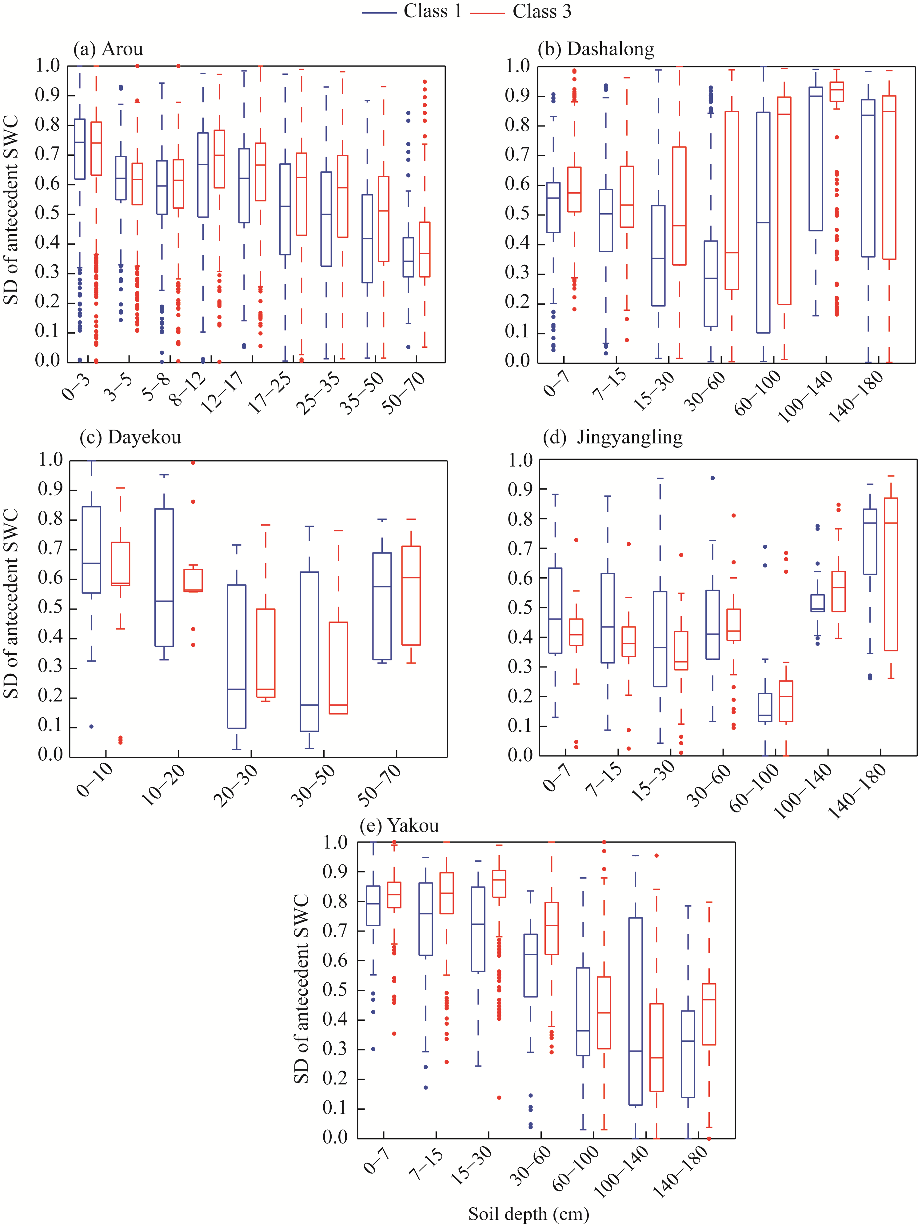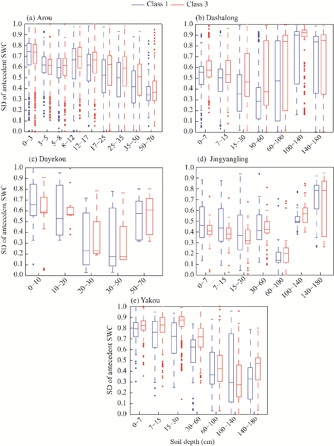 Fig. 8 SD of antecedent SWC for two subsurface hydrological partitioning classes (Class 1 and Class 3) during precipitation process. (a), Arou; (b), Dashalong; (c), Dayekou; (d), Jingyangling; (e), Yakou. Boxes in the figure indicate the IQR (interquartile range, 75th to 25th of the data). The median value is shown as a line within the box. Outlier is shown as blue or red circle. Whiskers extend to the most extreme value within 1.5×IQR. |